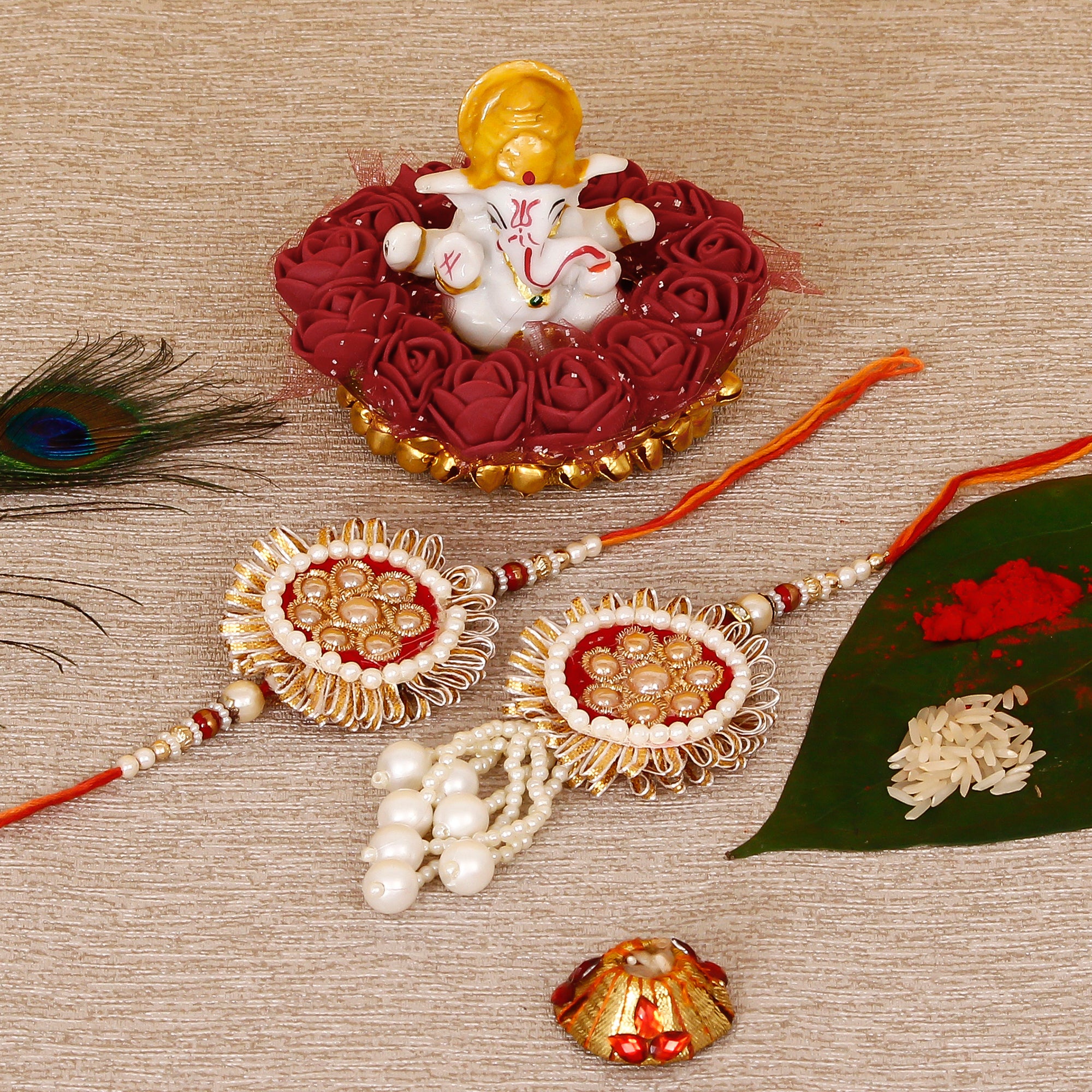 Designer Bhaiya Bhabhi Rakhi with Lord Ganesha Idol on Decorative Plate for Car & Home and Roli Tikka Matki - eCraftIndia Online