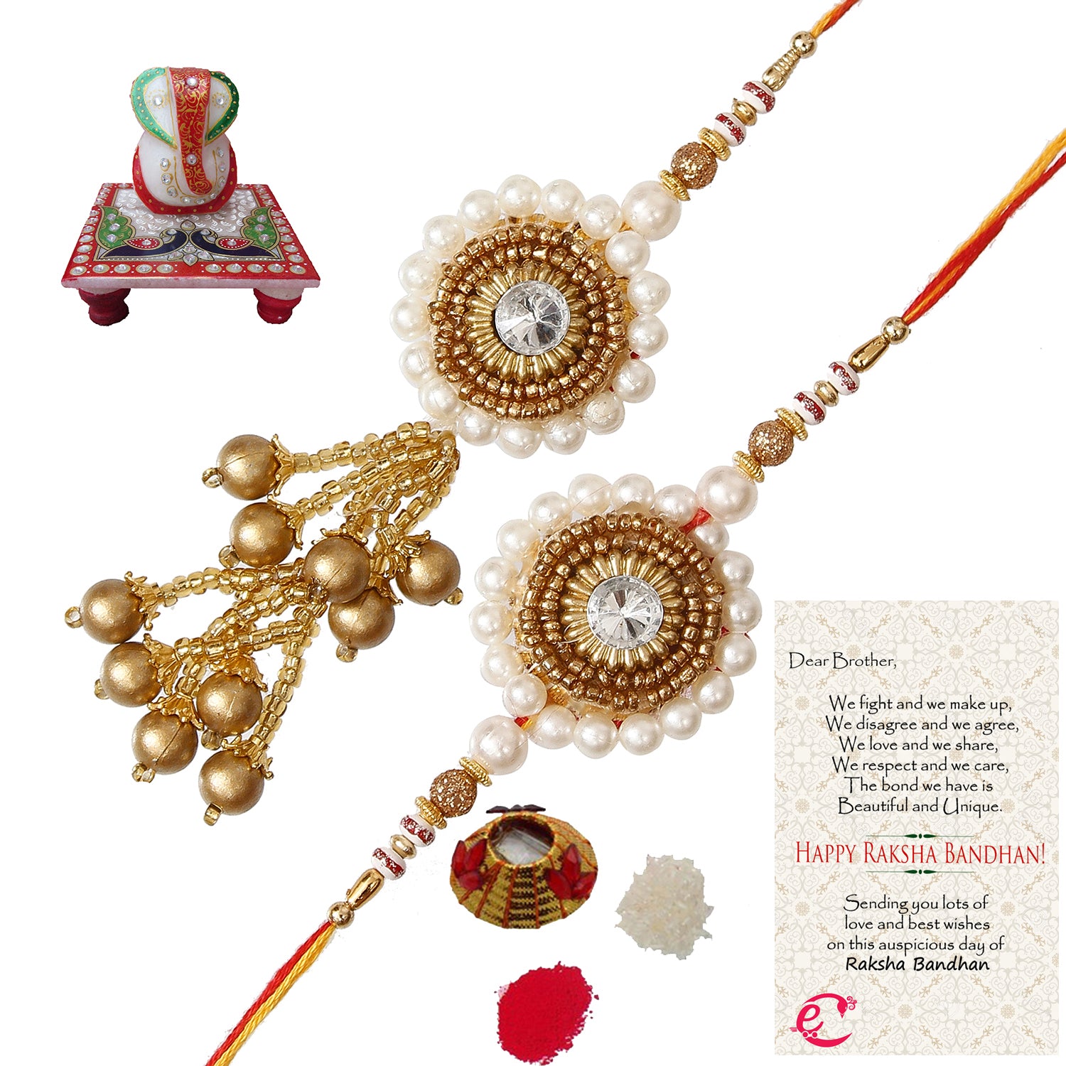 Designer Bhaiya Bhabhi Rakhi with Lord Ganesha Marble Chowki and Roli Tikka Matki, Best Wishes Greeting Card - eCraftIndia Online