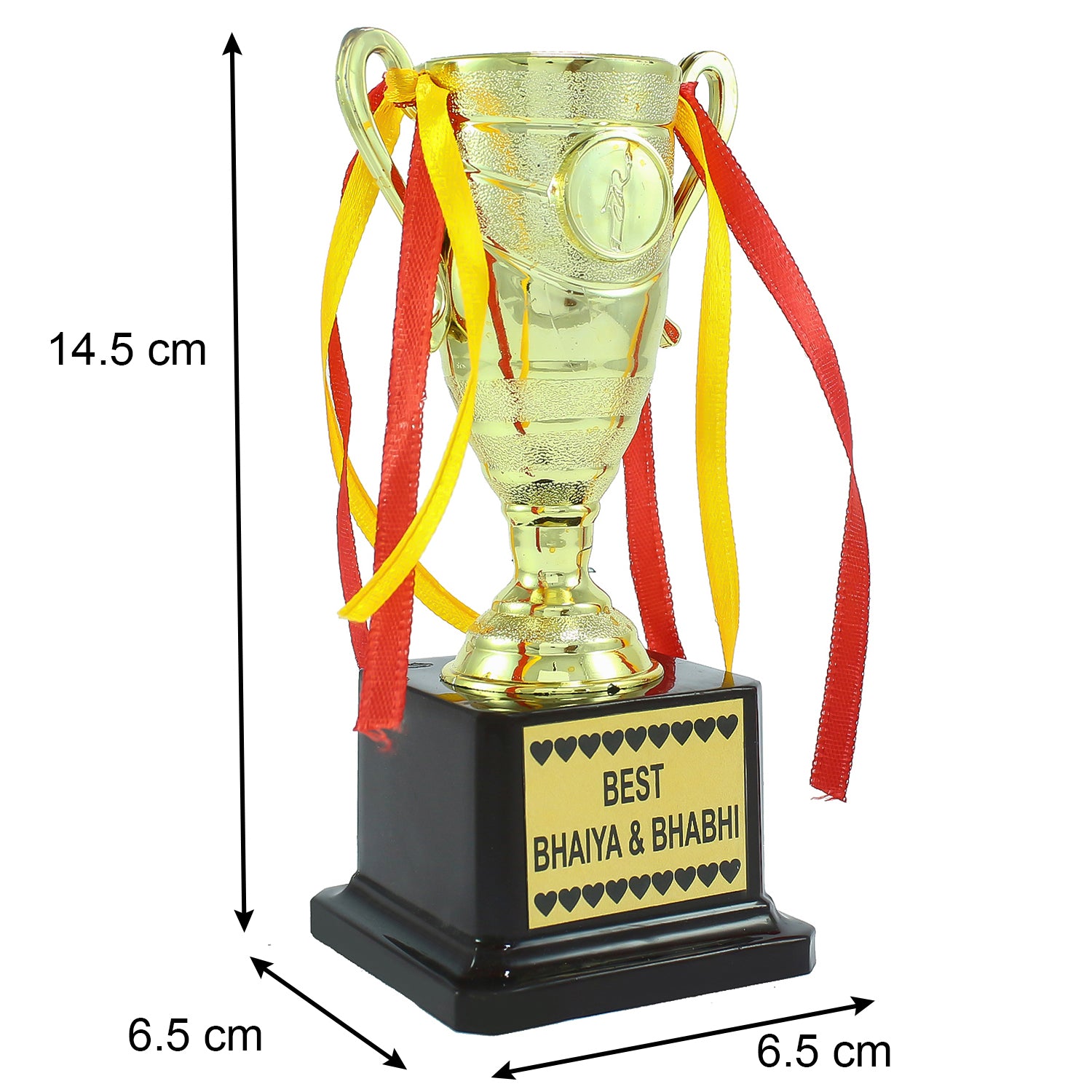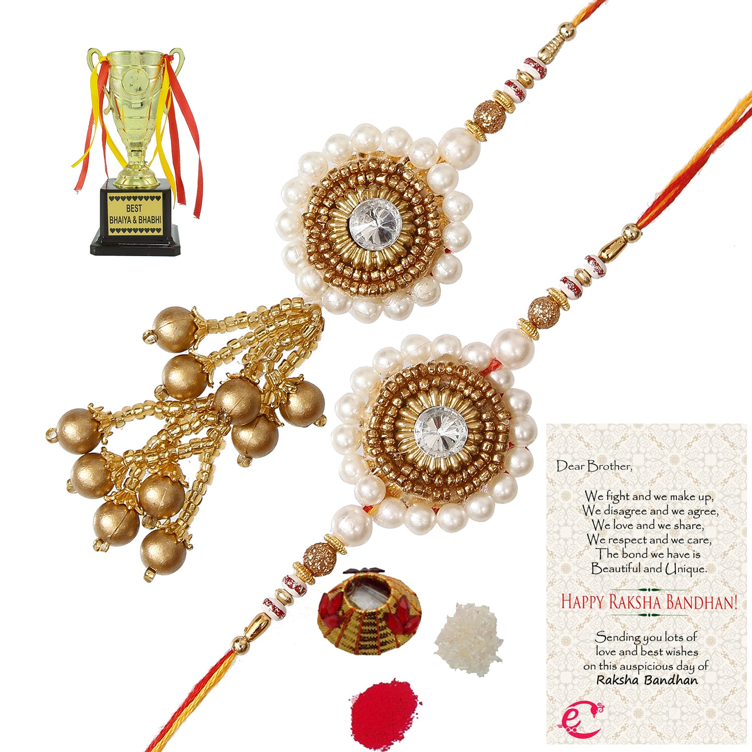 Designer Bhaiya Bhabhi Rakhi with Best Bhaiya Bhabhi Trophy and Roli Tikka Matki, Best Wishes Greeting Card - eCraftIndia Online