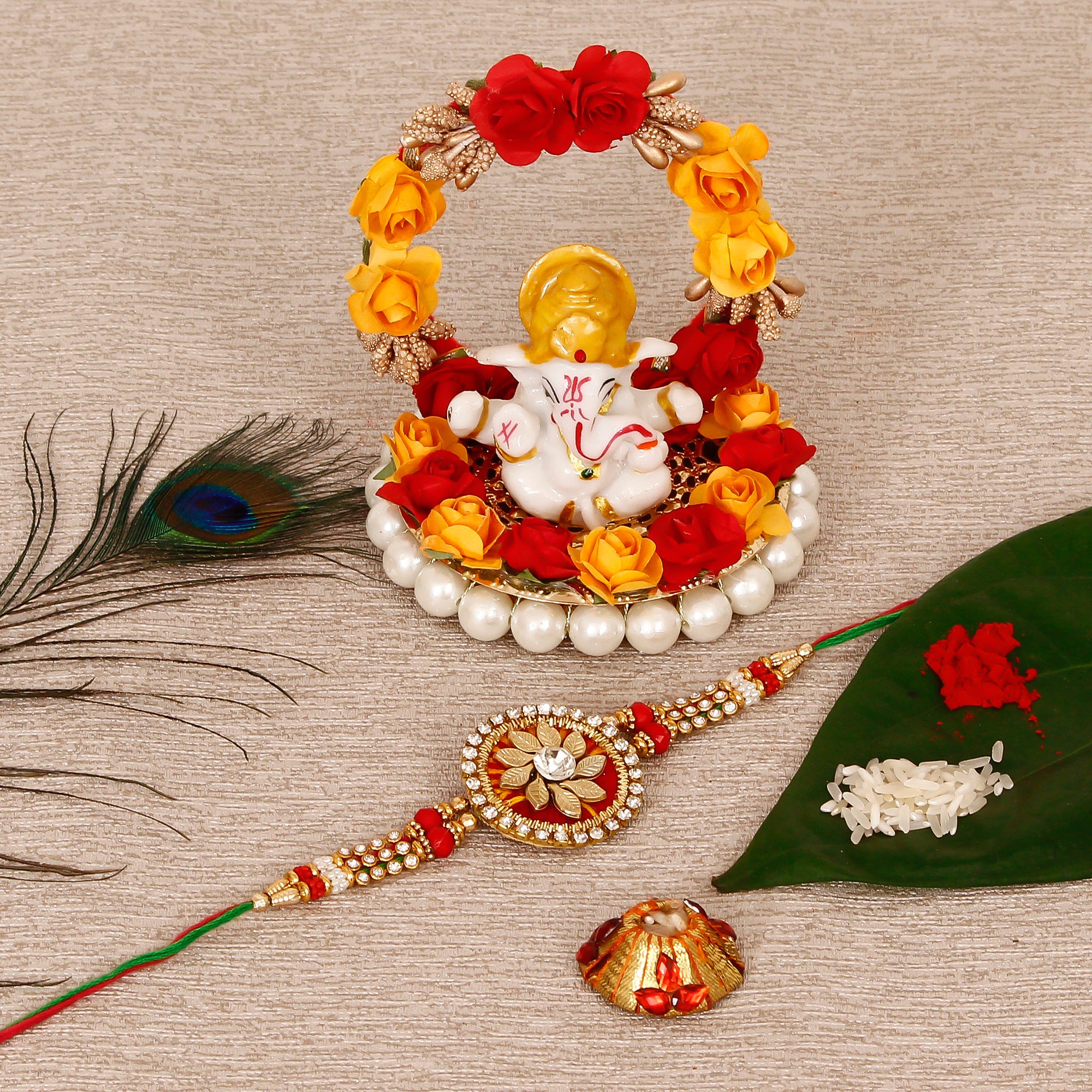 Designer Rakhi with Lord Ganesha Idol on Decorative Plate for Car & Home and Roli Tikka Matki - eCraftIndia Online