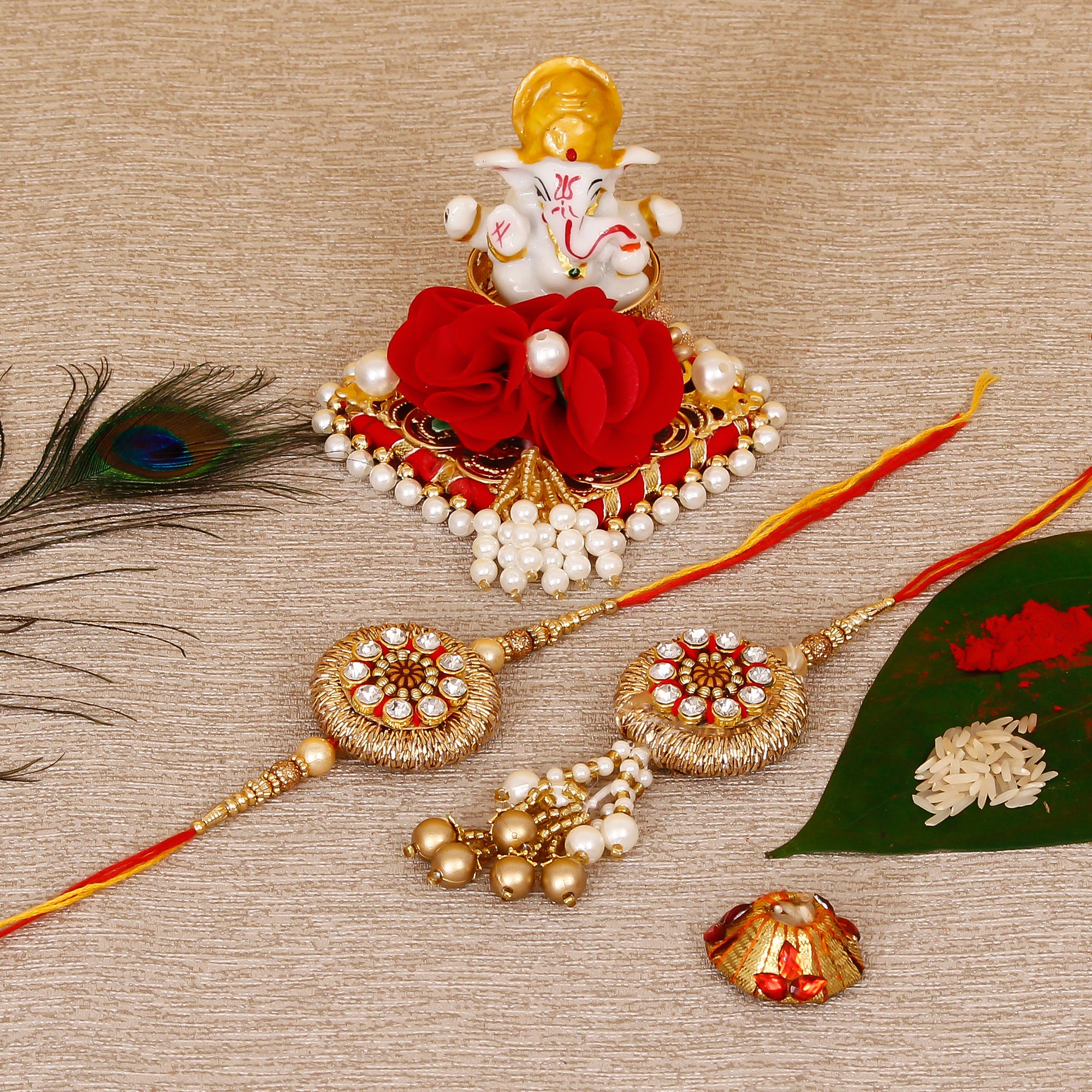 Designer Bhaiya Bhabhi Rakhi with Lord Ganesha Idol on Decorative Plate for Car & Home and Roli Tikka Matki - eCraftIndia Online