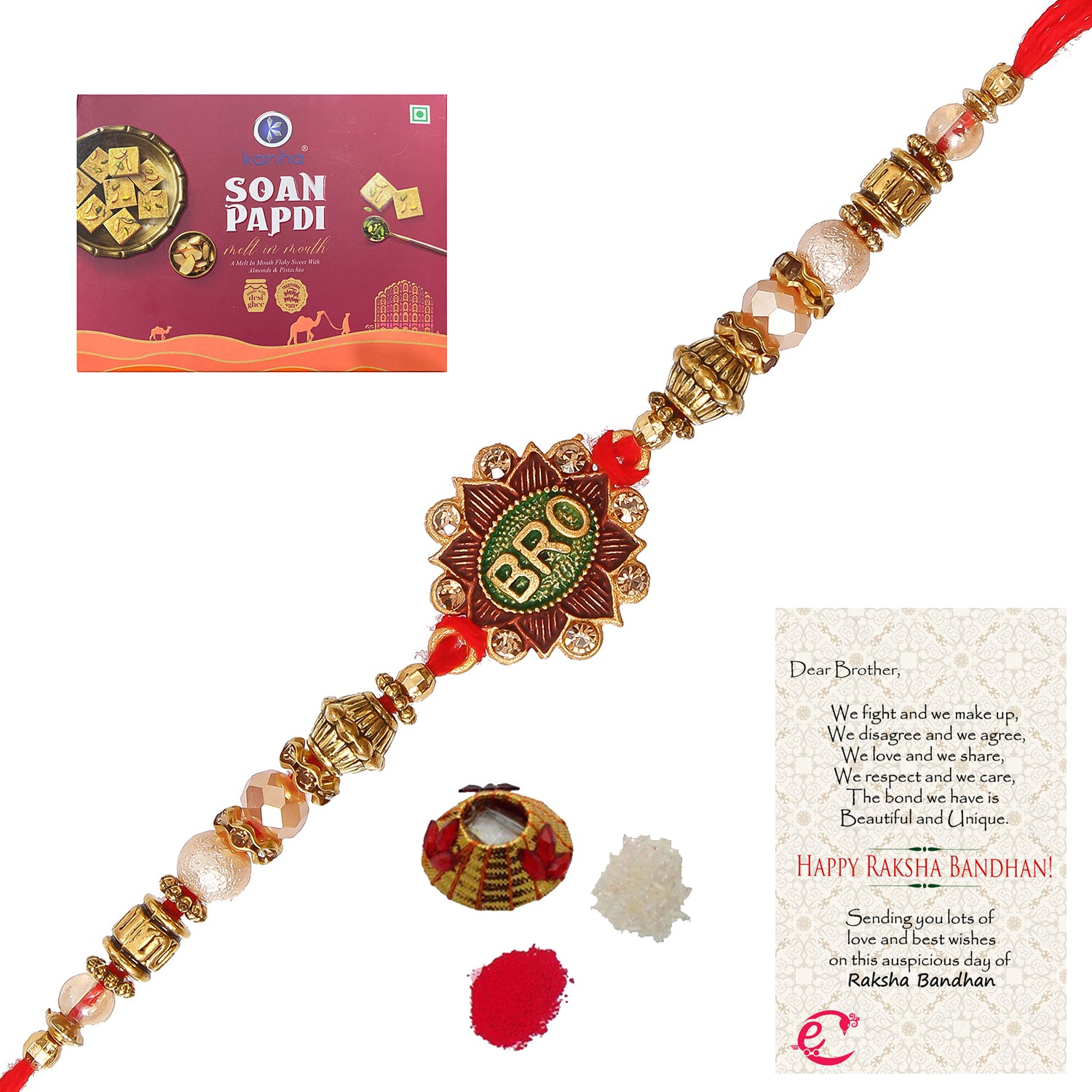Designer Rakhi with Soan Papdi (500 Gm) and Roli Tikka Matki, Best Wishes Greeting Card - eCraftIndia Online
