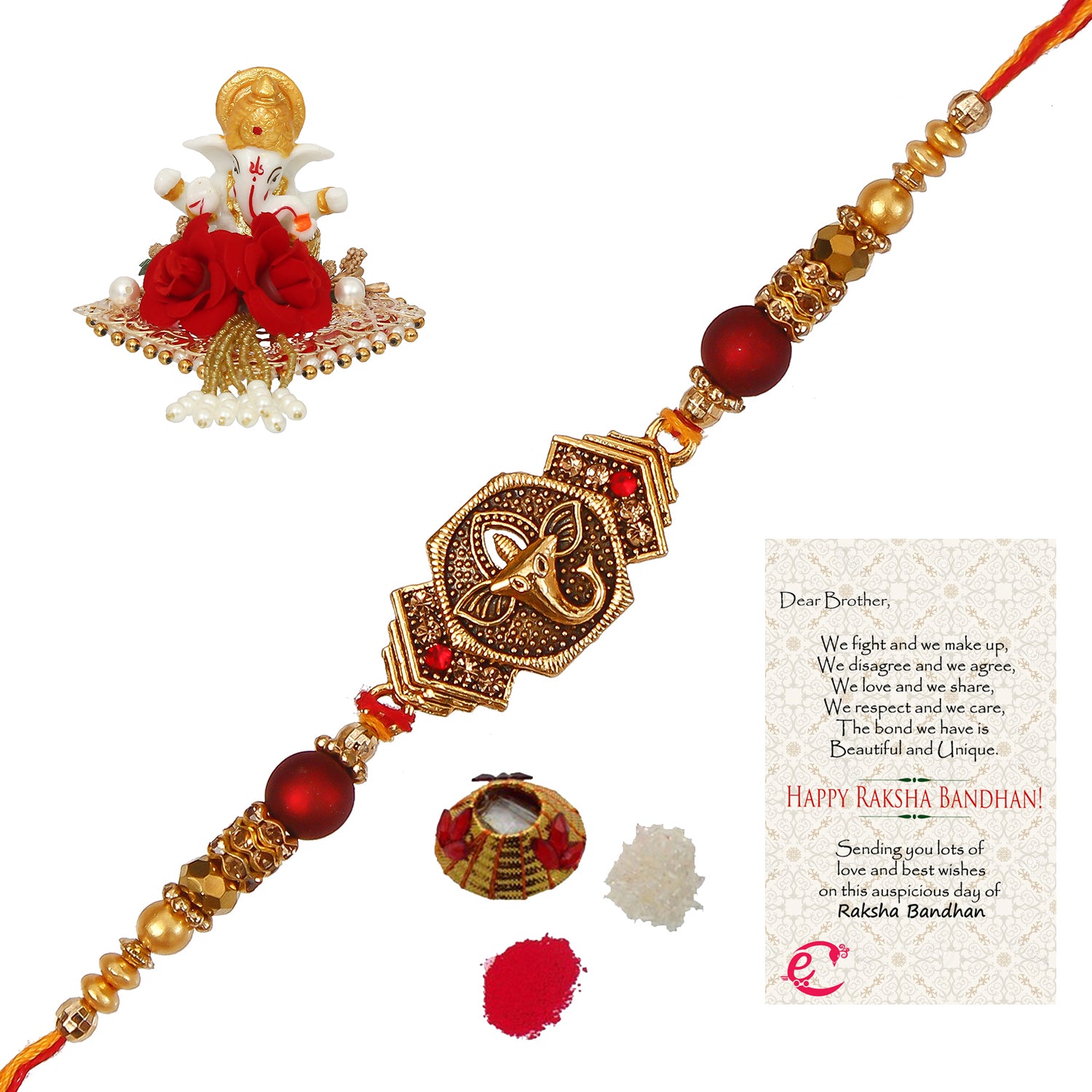 Designer Religious Ganesha Rakhi with Lord Ganesha Idol on Decorative Plate for Car & Home and Roli Tikka Matki, Best Wishes Greeting Card - eCraftIndia Online