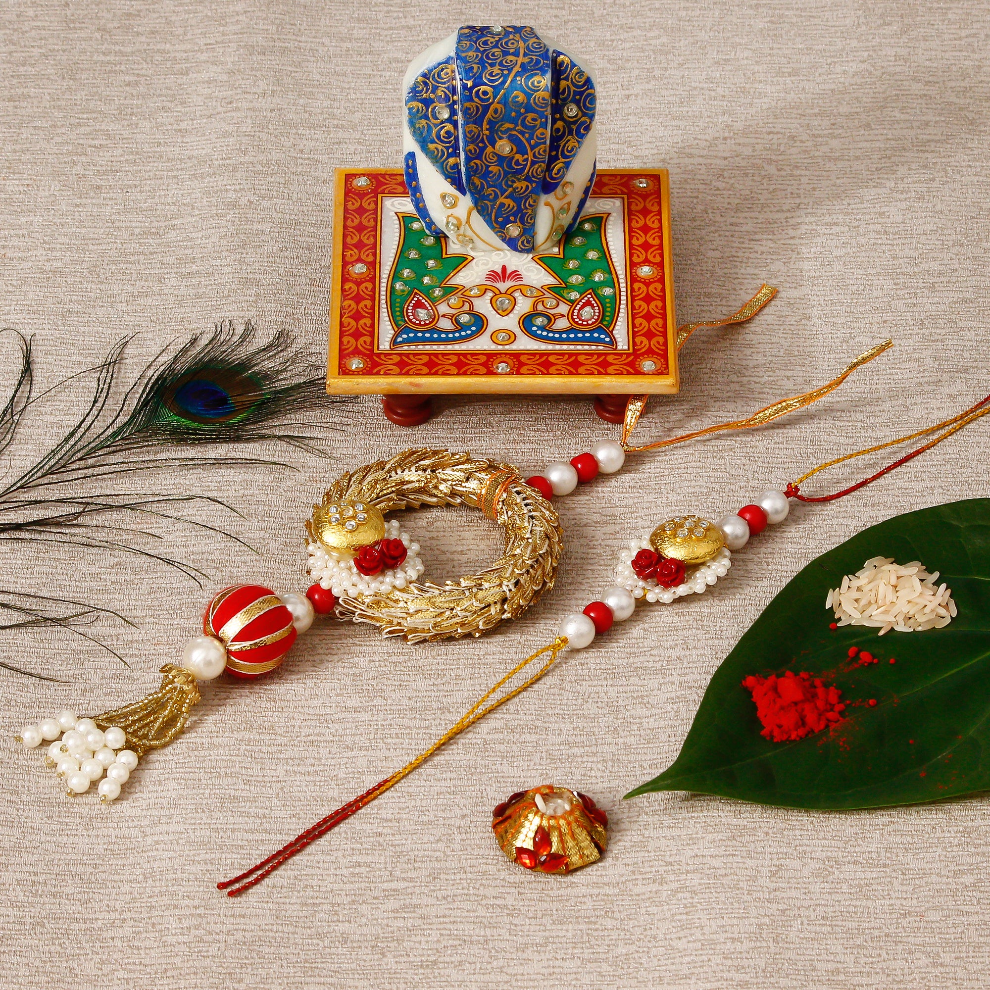 Designer Bhaiya Bhabhi Rakhi with Lord Ganesha on Marble Chowki and Roli Tikka Matki - eCraftIndia Online