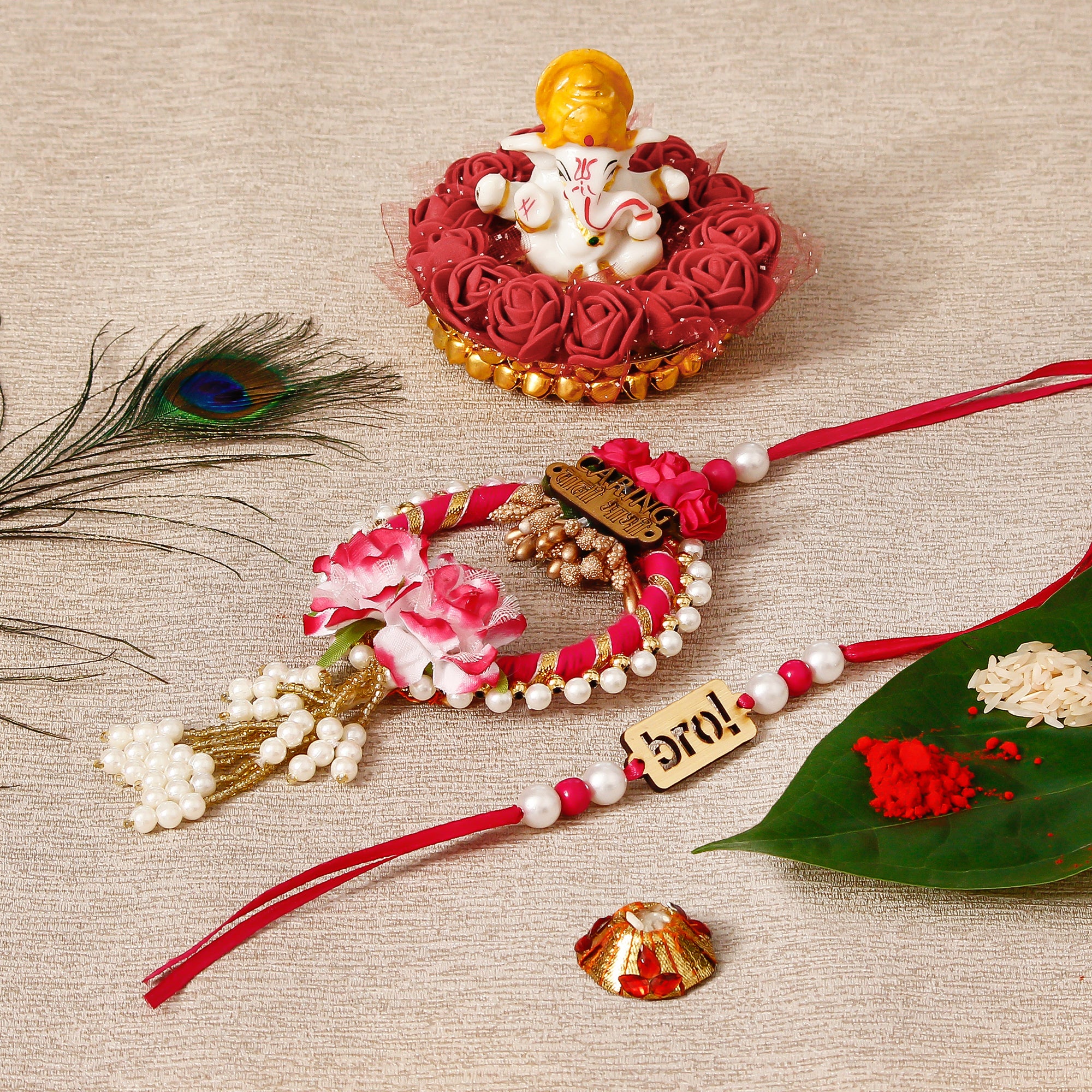 Designe Bhaiya Bhabhi Rakhi with Lord Ganesha Idol on Decorative Plate for Car & Home and Roli Tikka Matki - eCraftIndia Online