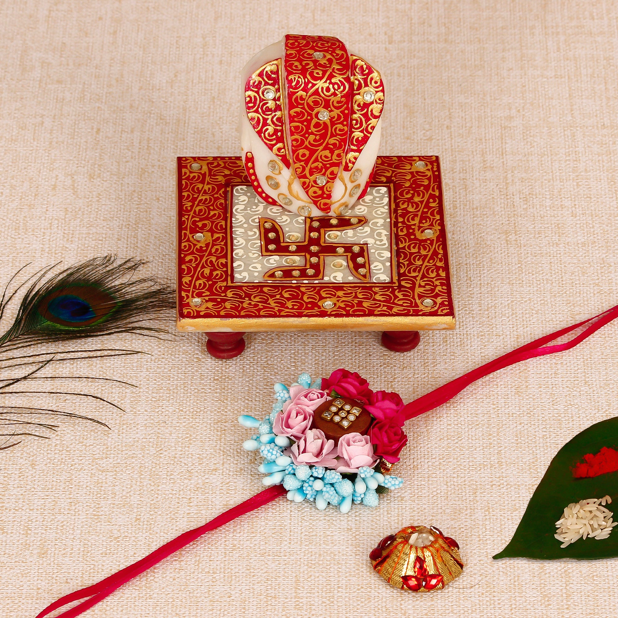 Designer Floral Rakhi with Ridhi Sidhi Marble chowki and Roli Tikka Matki
