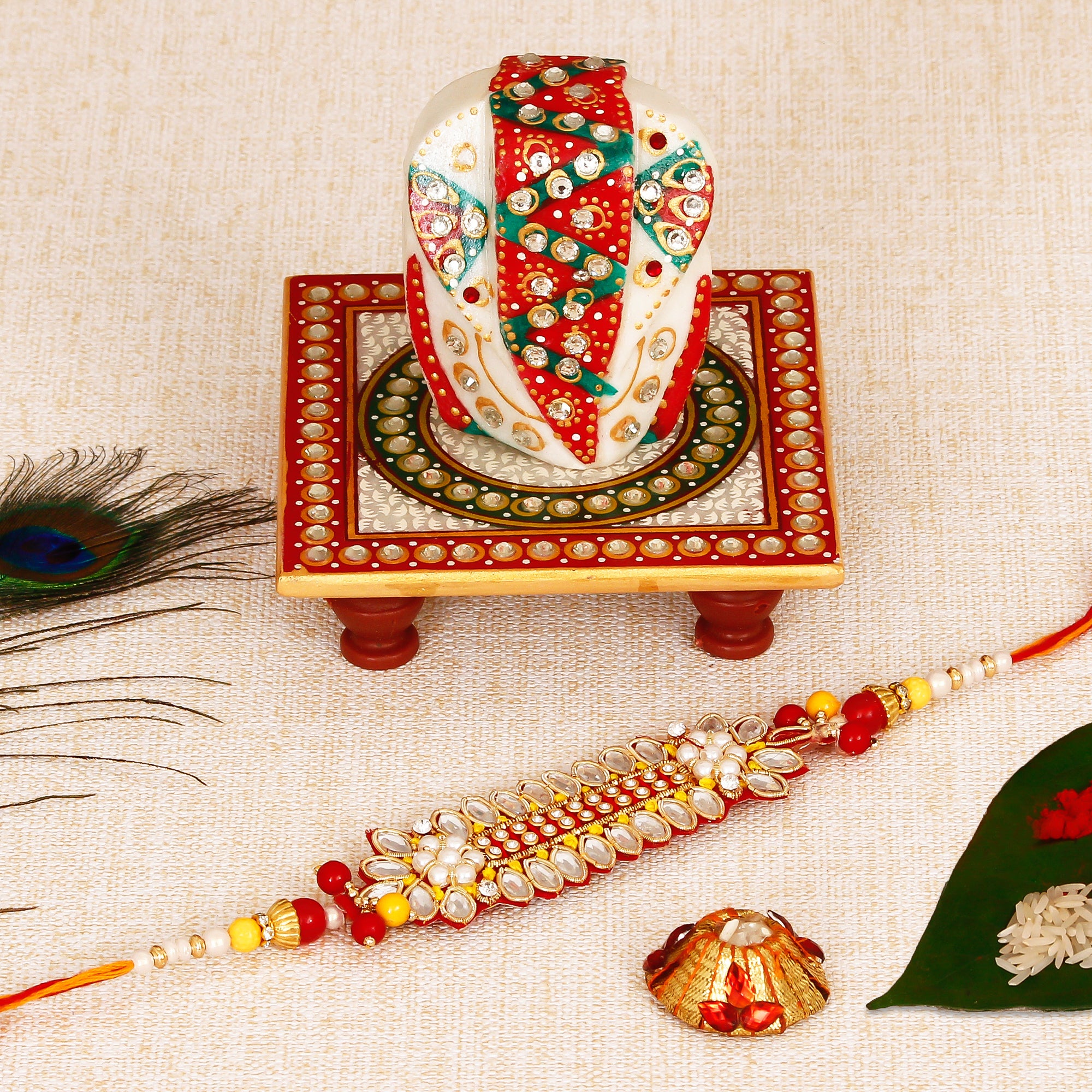 Designer Rakhi with Lord Ganesha on Kundan Studded Marble Chowki and Roli Tikka Matki - eCraftIndia Online