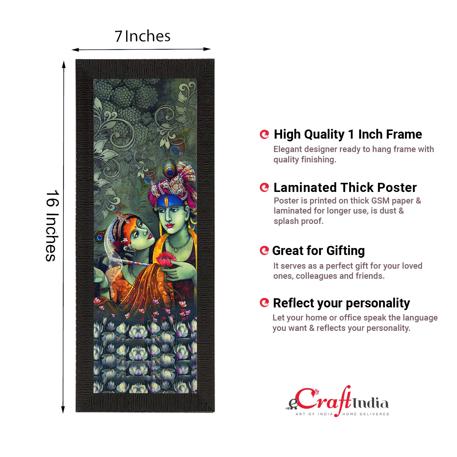 Product Description - Radha Krishna is known as the epitome of love & sacrifice. They are set as an example when it comes to ideal couples & relationships. All our paintings come in various hues as well as different add-ons that are surely going to enhance your wall decoration. Hence, these framed wall paintings make a great gift option for the newly weds, or your favorite couple that is bound to bring in love & good vibes always. Our Radha Krishna UV matt textured framed paintings are available in sets as well that will help you incorporate the entire wall space creatively. Each design reflects the artistic qualities and time one has taken to design this painting. These frames don't include glass so it is very lightweight and wet cloth can be used to clean them. Exquisitely printed and framed, it is also a perfect gifting option for your colleagues, loved ones, and family members.