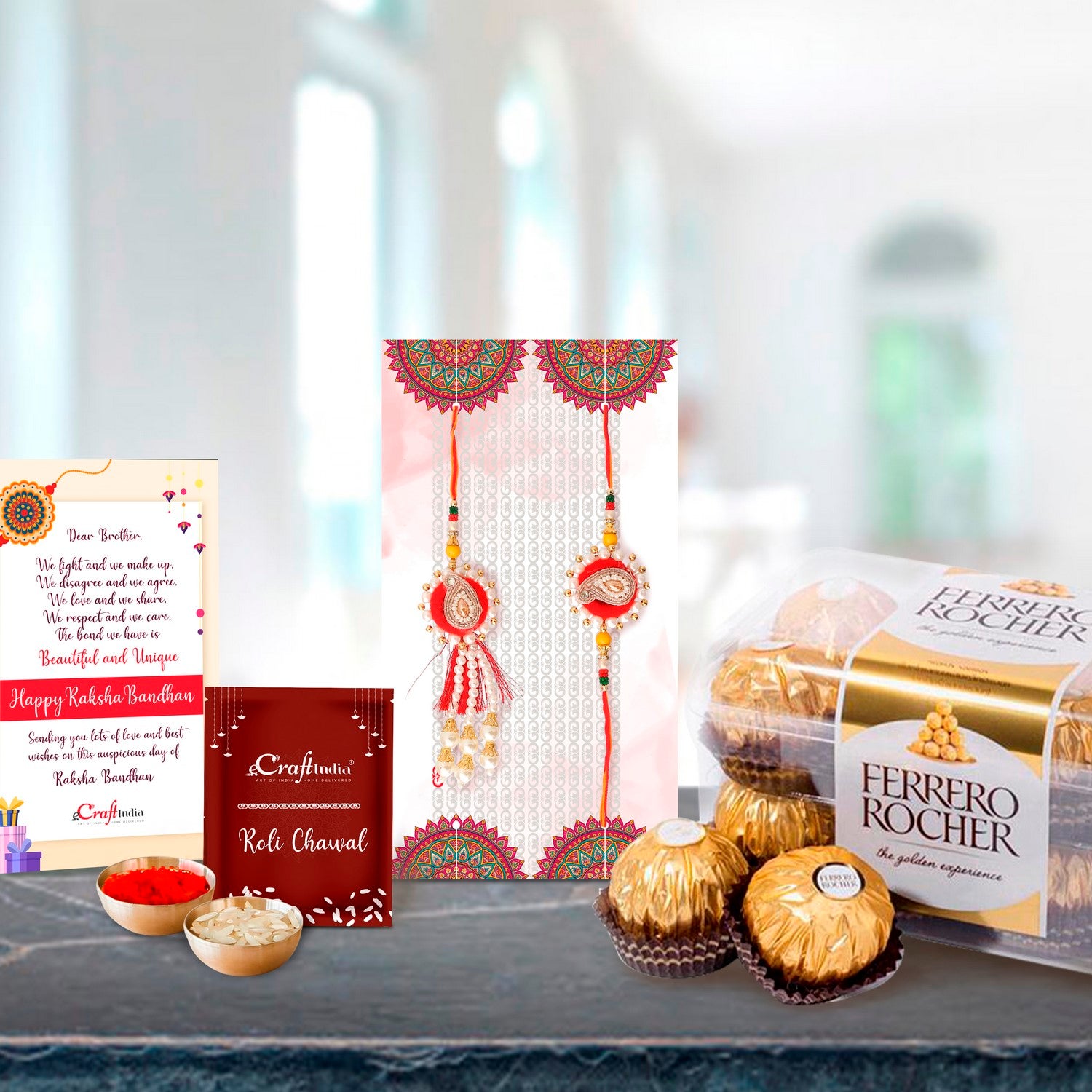 Bhaiya Bhabhi Rakhi with Ferrero Rocher (16 pcs) and Roli Chawal Pack, Best Wishes Greeting Card - eCraftIndia Online