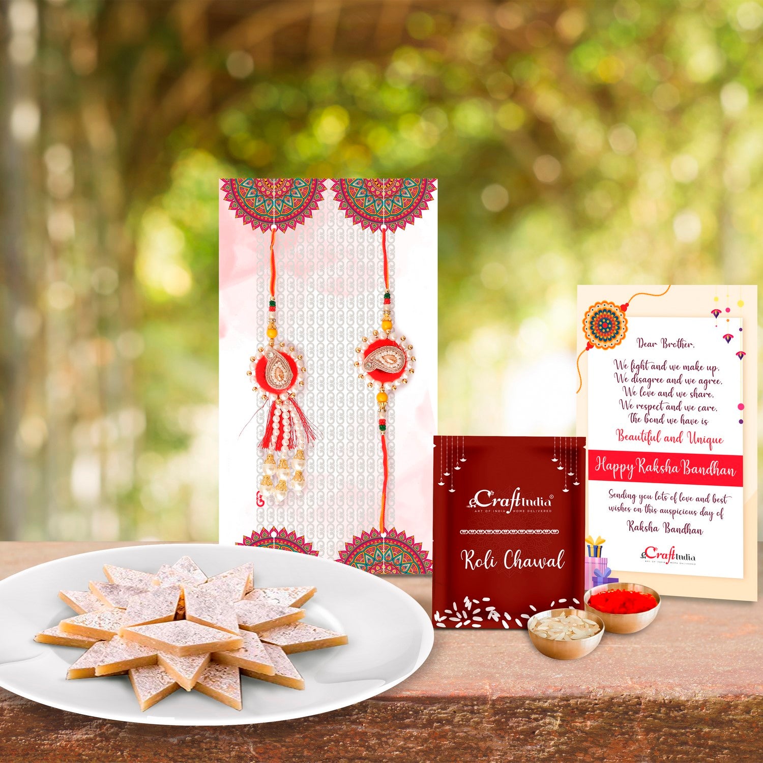 Bhaiya Bhabhi Rakhi with Kaju Katli (500 Gm) and Roli Chawal Pack, Best Wishes Greeting Card - eCraftIndia Online