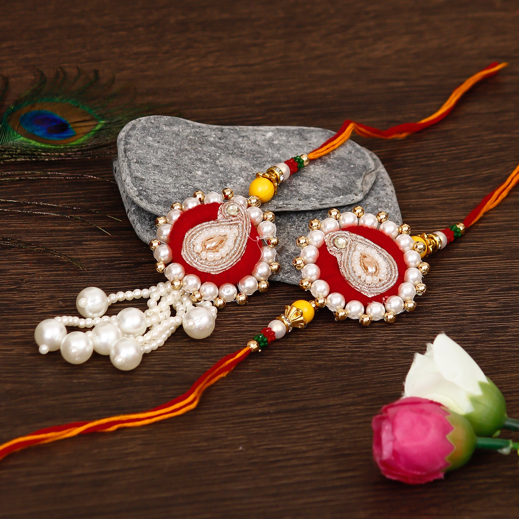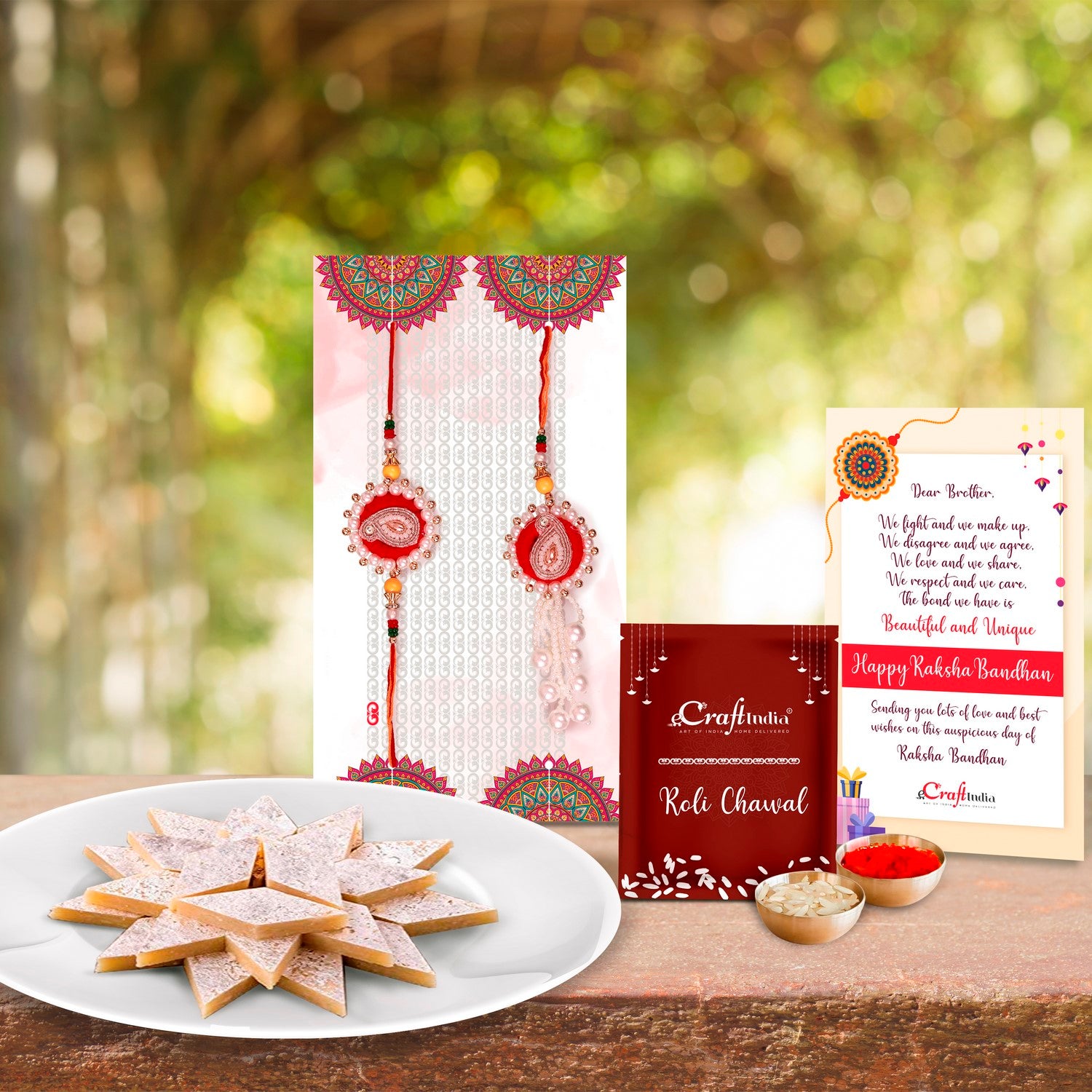 Bhaiya Bhabhi Rakhi with Kaju Katli (500 Gm) and Roli Chawal Pack, Best Wishes Greeting Card - eCraftIndia Online