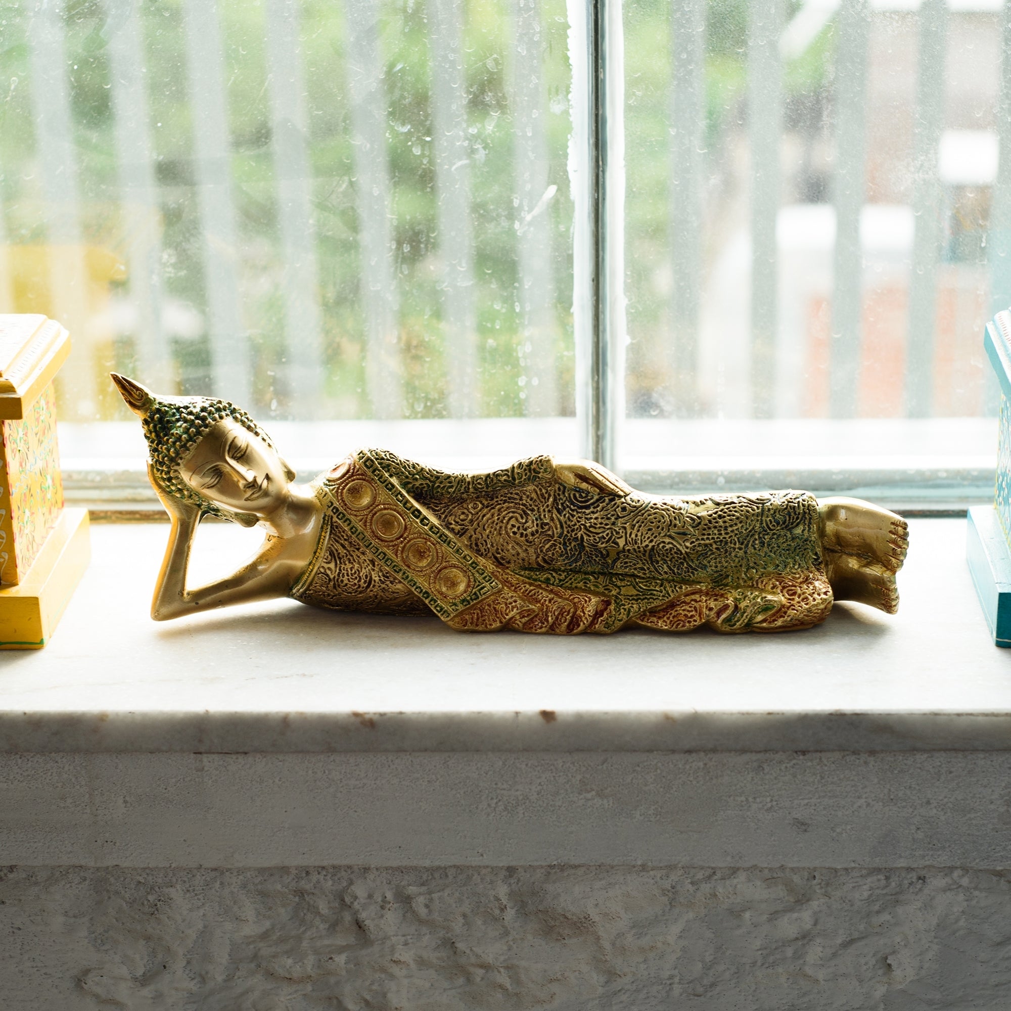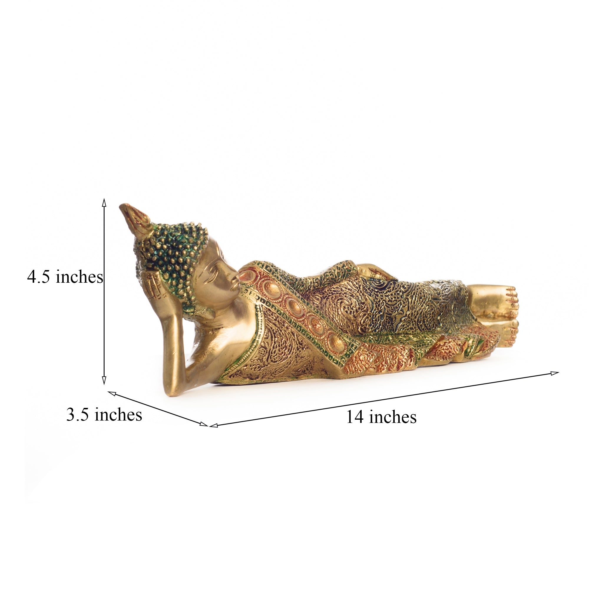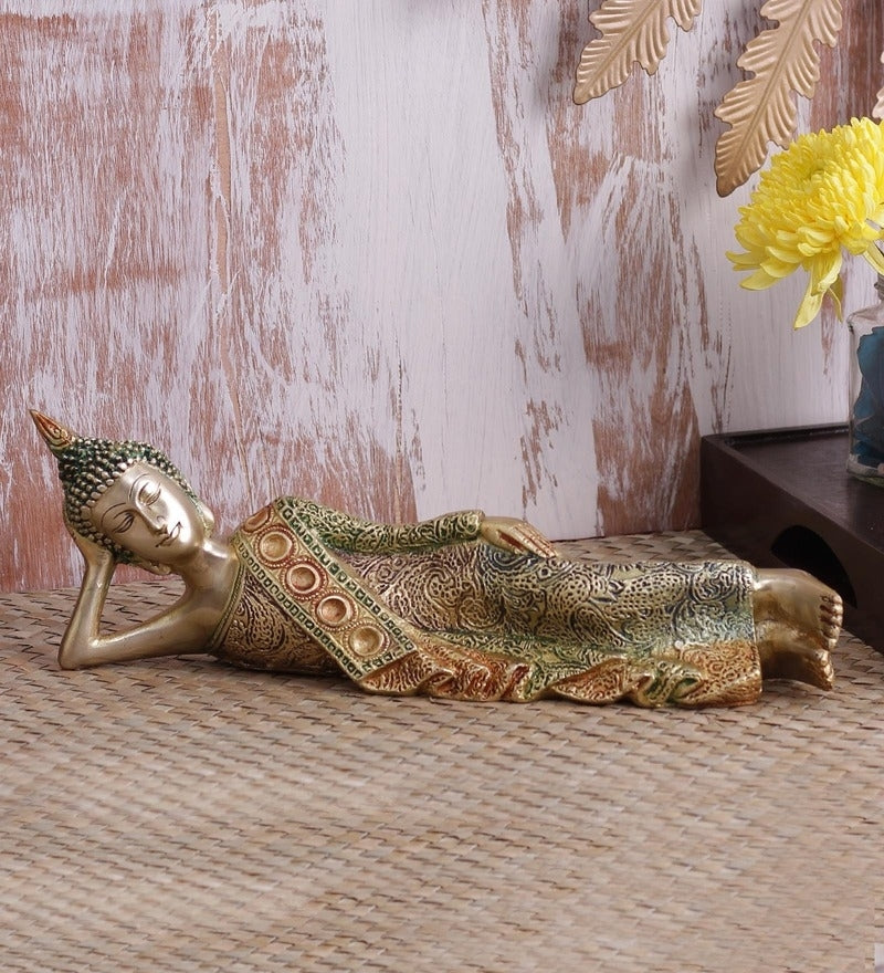 Product Description - One of Buddhism's most important iconographic and statuary patterns is the statue of the Lord Buddha reclining. It depicts the actual Buddha, who is seen lying on his right side and holding his head with his right hand. Lord Buddha has always powerfully stood for peace. Therefore, what could be a better present or choice to carry home than the idol of Lord Buddha? The idol is exquisitely crafted from the metal of the highest quality. Skilled artisans from the company of eCraftIndia lovingly constructed and colored this statue using a variety of traditional methods. You can further gift this Lord Buddha idol to your loved ones as a good luck gift that they will forever cherish.