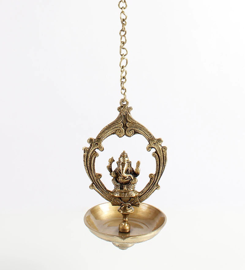Product Description - There are diyas and then there are diyas that become conversation starters like if you want a diya that is a statement piece, a conversation starter. Complete your temple walls with Brass Lord Ganesha Hanging Oil Wick Diya - 22Inch Long Chain that is the best for your temple décor that comes in brown and golden colors. It gives the best religious décor feel and is the best for your everyday rituals of lighting a diya. This is a great gift for your friends and family when it comes to religious celebrations and festivities. To complement the wall hanging and Diya's, makers have given it a complete finish, making it one of the most pious and auspicious additions to any modern home. This diya has been enthusiastically handcrafted and colored by skilled artisans from the house of eCraftIndia using various conventional techniques.