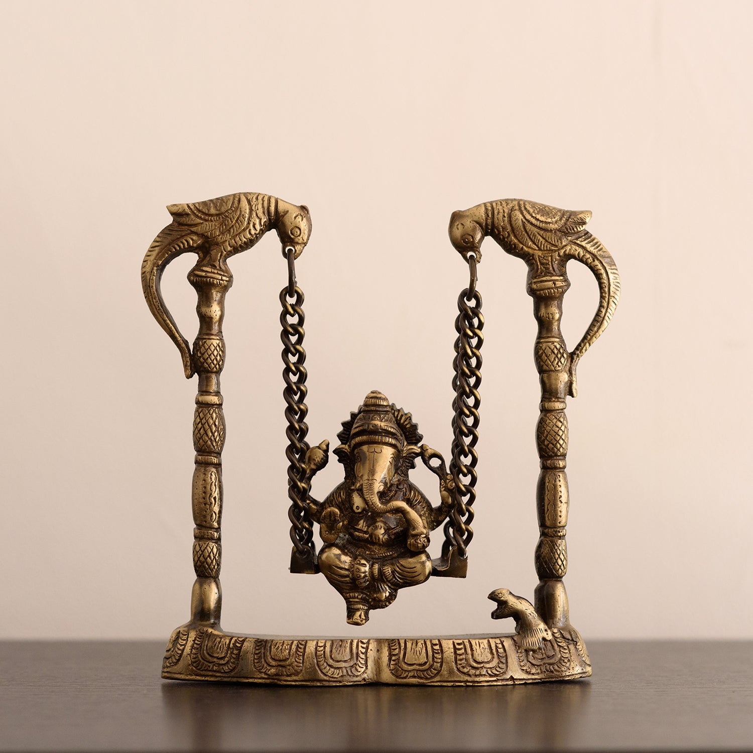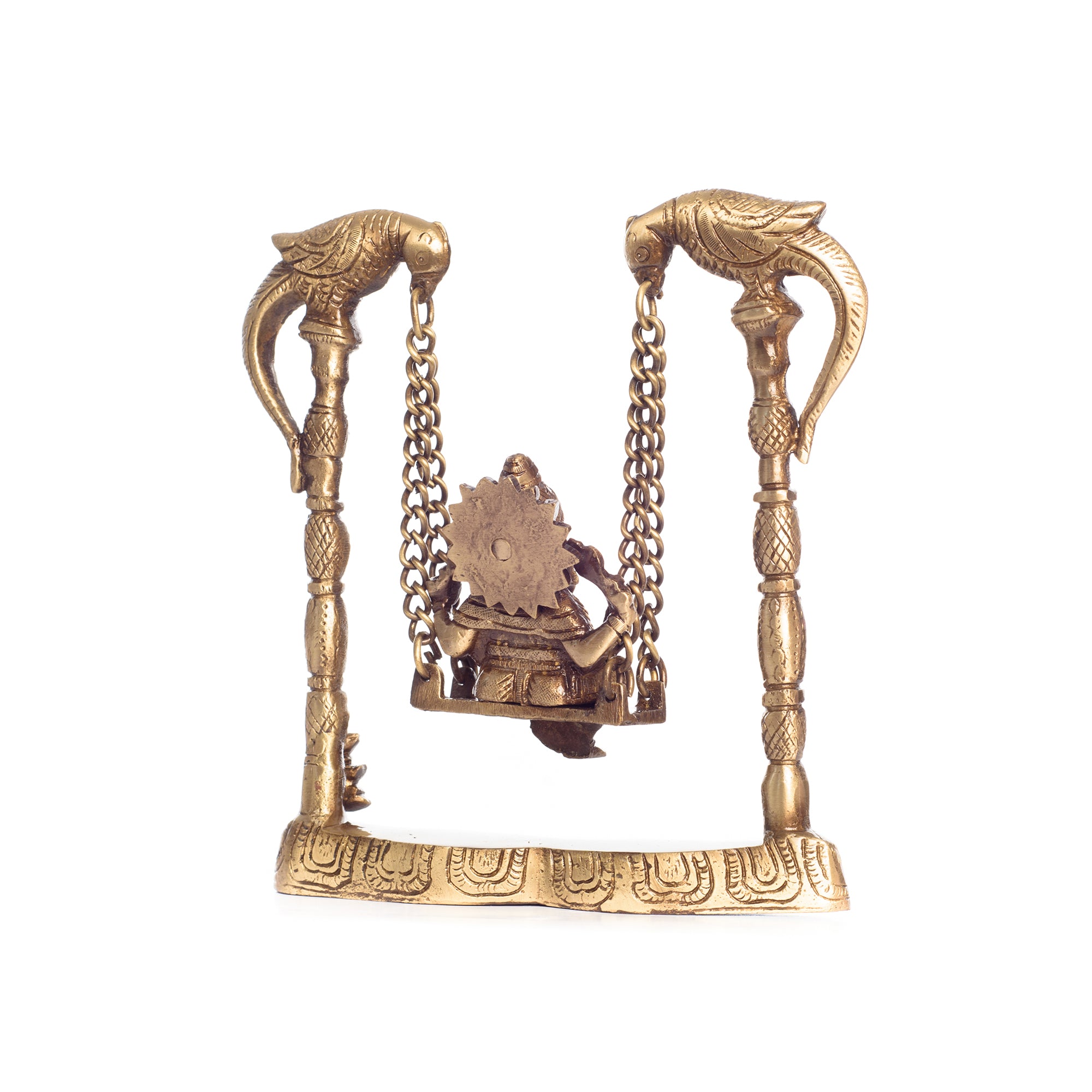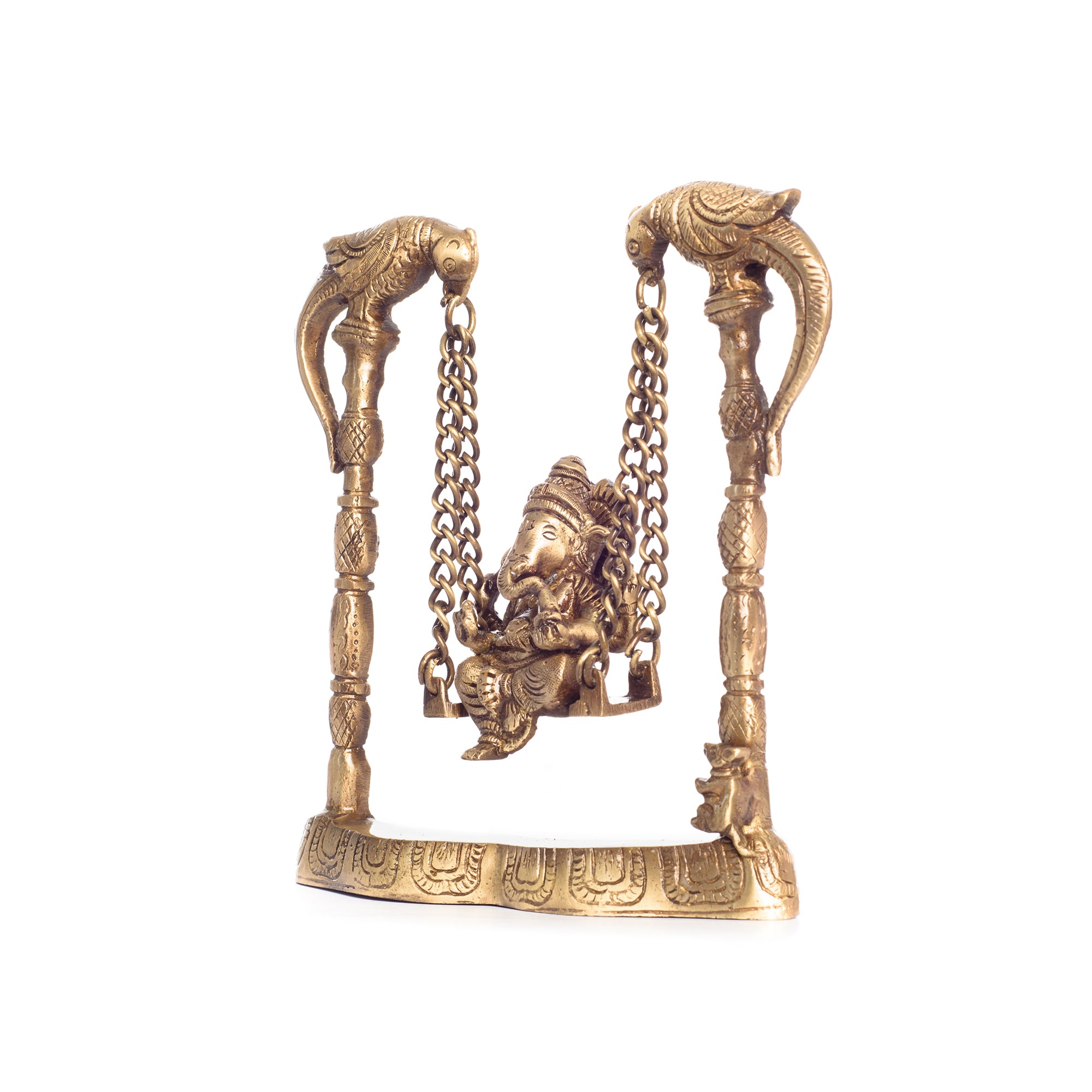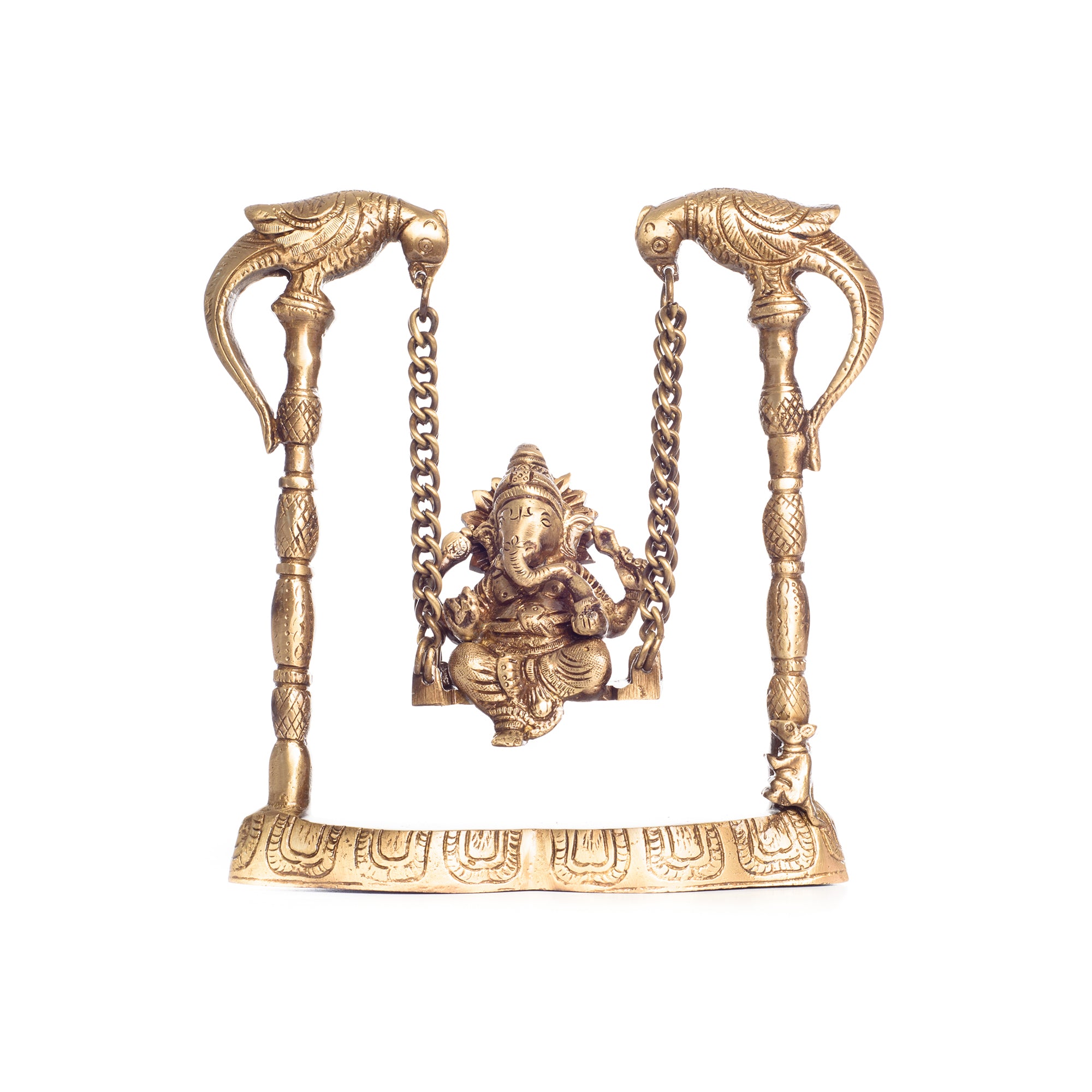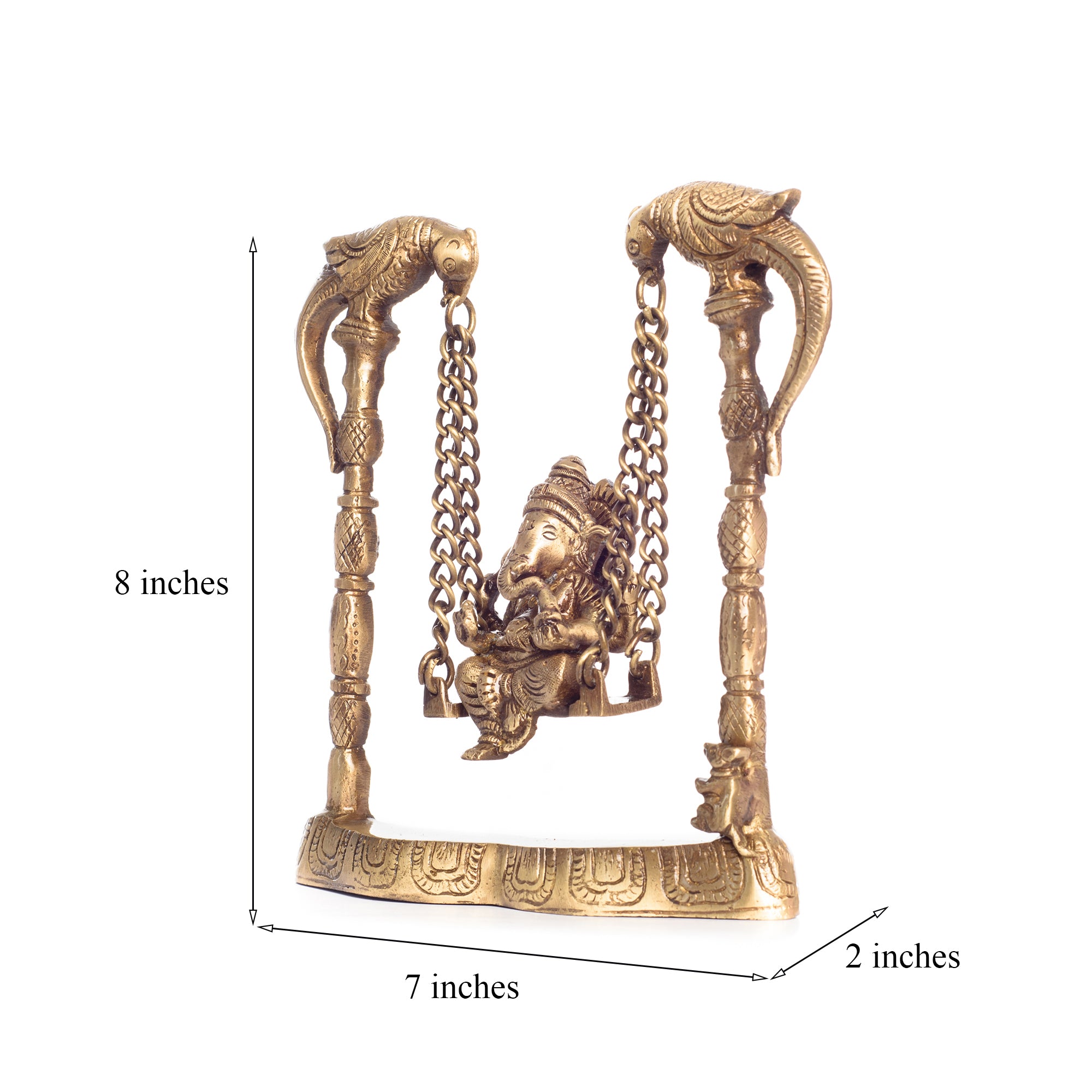 Product Description - Sitting on an intricately crafted jhoola, is a Ganesha, ready to bless you and your home – this majestic-looking Ganesha on a jhoola is perfect for your living room or even your pooja room. The brass used for the creation of this jhoola is high quality, ensuring longevity and easy maintenance. Our Brass Lord Ganesha on Parrot jhoola/swing metal figurine is the best to keep in your home as it enhances your home style and adds elegance to your space. This figurine is the best to keep in your mandir or in the living room during religious festivities and celebrations. This handmade article is made by our skilled artists at the dwelling of eCraftIndia and is also a great gifting option for your friends and family. You can find many such God idols and figurines in many different avatars on our online portal that your guests are sure to adore.