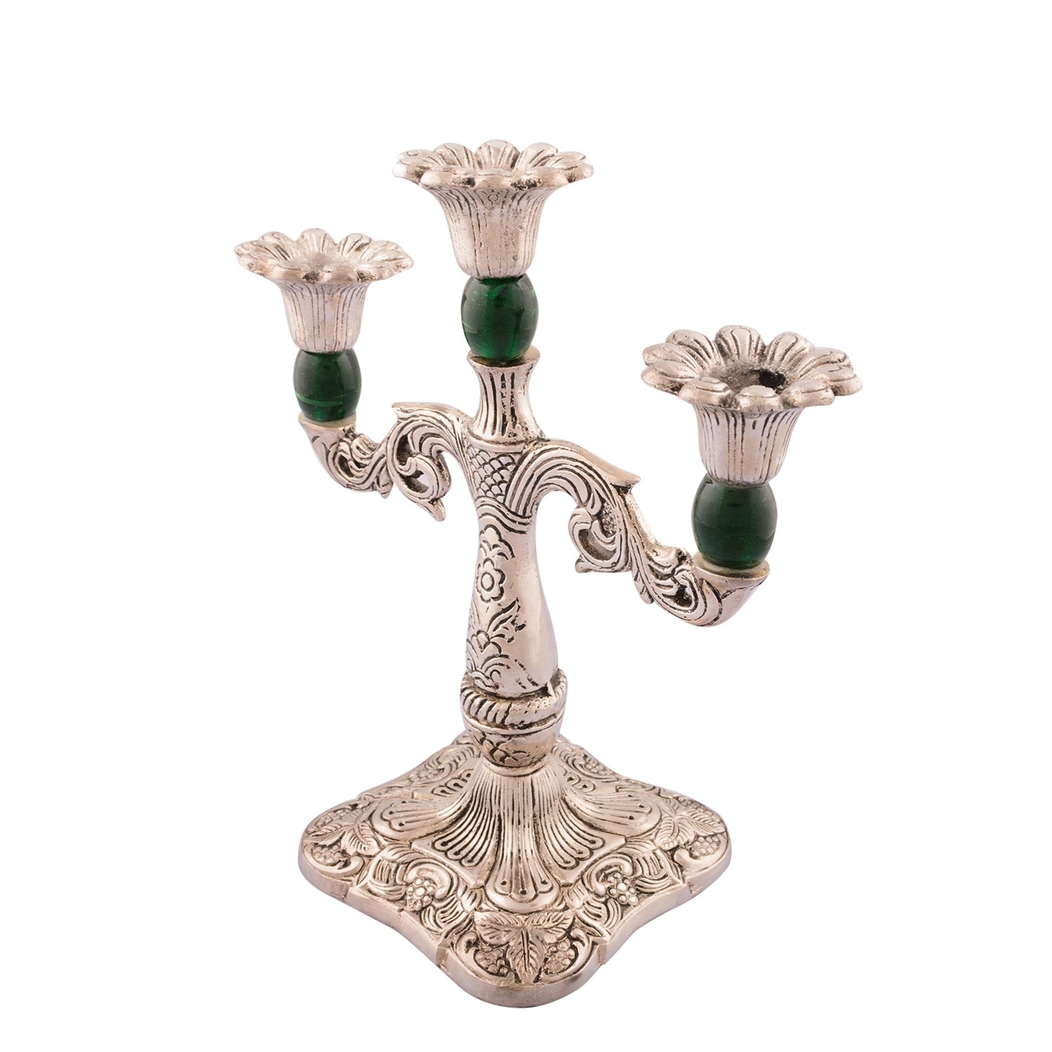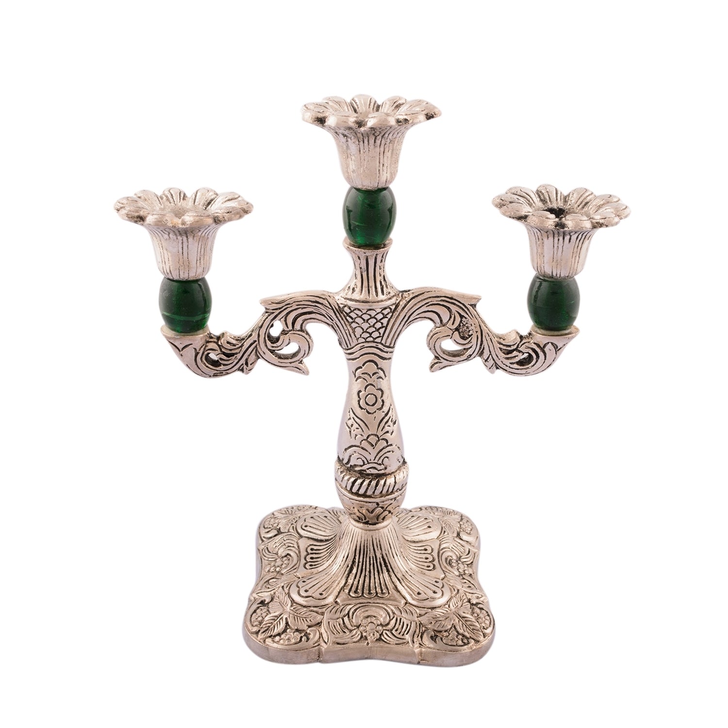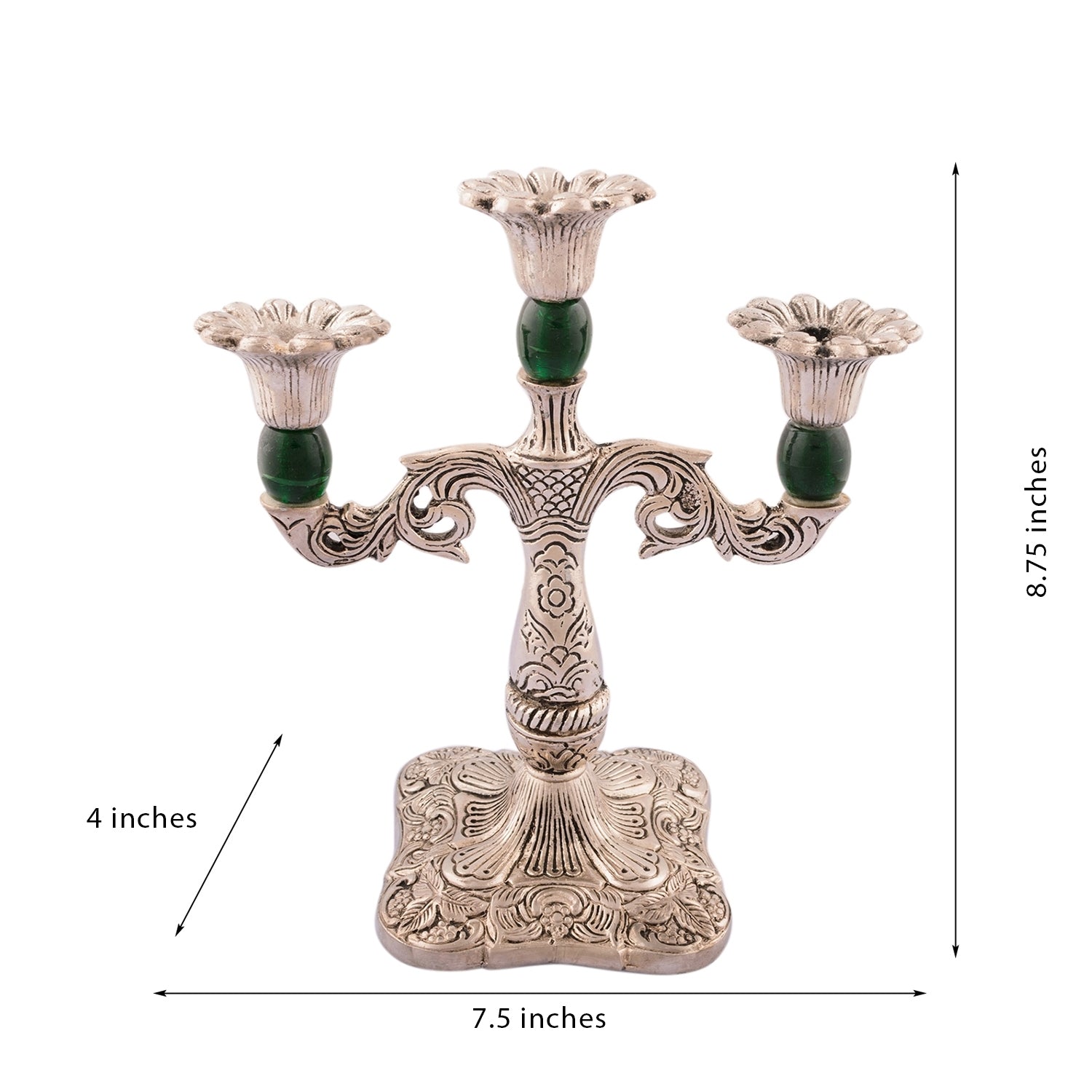 Product Description - Candle stands have been in vogue for ages now and continue to be. And at eCraftIndia, you can discover our white metal silver & green 3-candle stand that makes a great home decor item. Decorate your home with our candle stands which are a great home decor item as well as a great gift. Each stand is diligently handcrafted by our professional artists by utilizing various inherited techniques. This stand serves as a great gift option for your friends and family when it comes to festival gifting. Adorn your home with this candle stand of ours and stand out when it comes to your home interior as it will give a touch of royalty to your home.