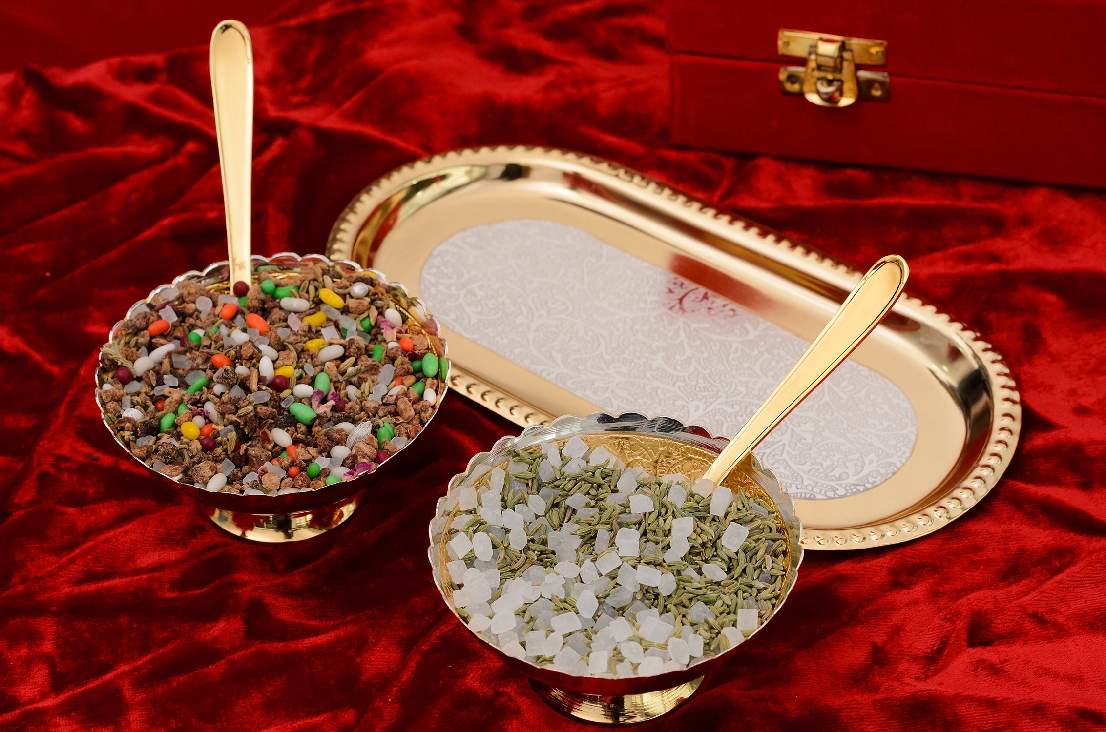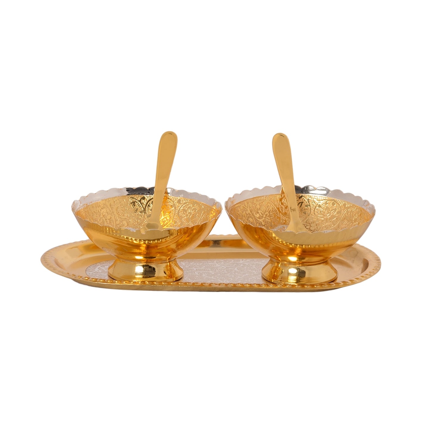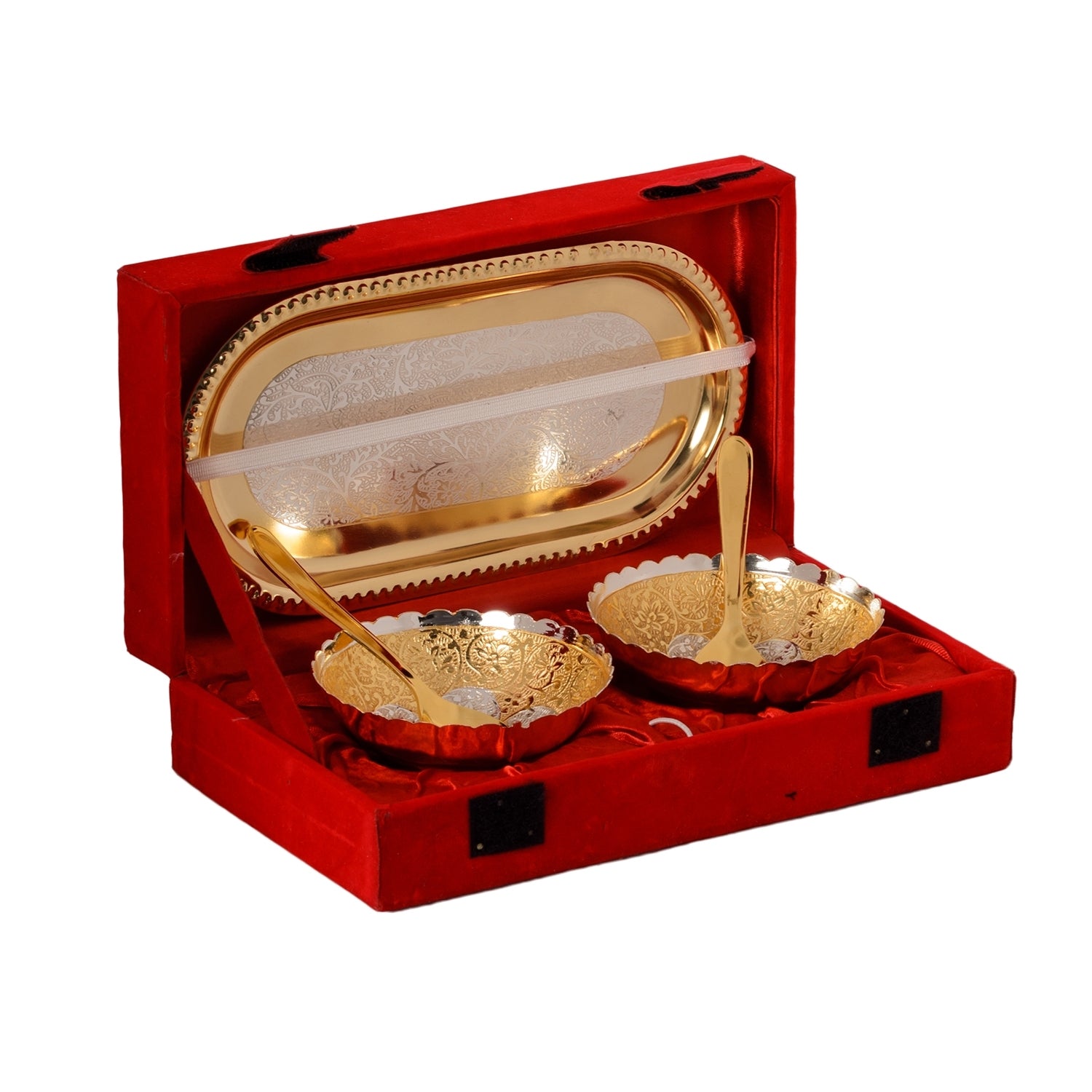 Package Content - One German Silver Multiutility Decorative Platter 2 Golden Bowl Set with Velvet Box