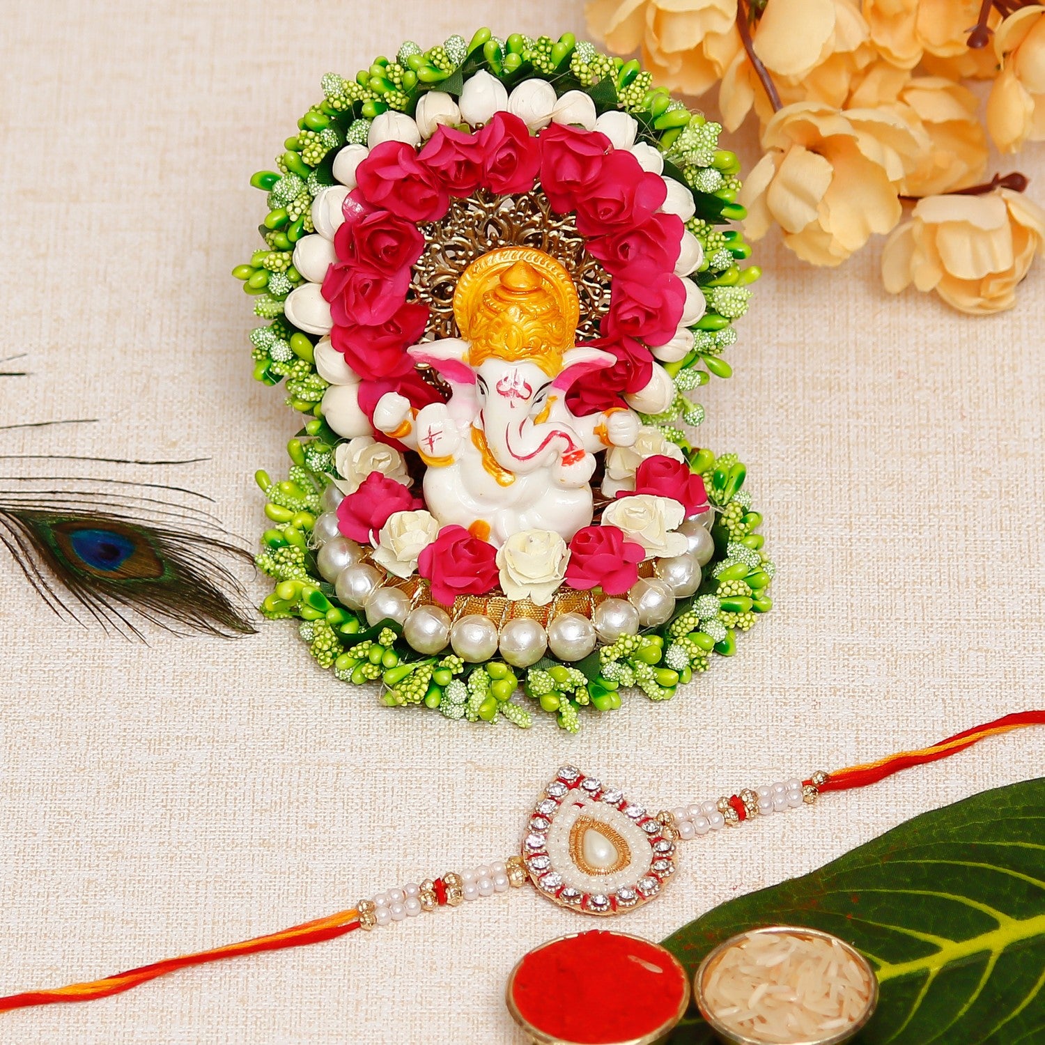 Desginer Stone and Pearl Rakhi with Lord Ganesha Idol on Decorative Handcrafted Green Floral Plate for Home and Car and Roli Chawal Pack - eCraftIndia Online