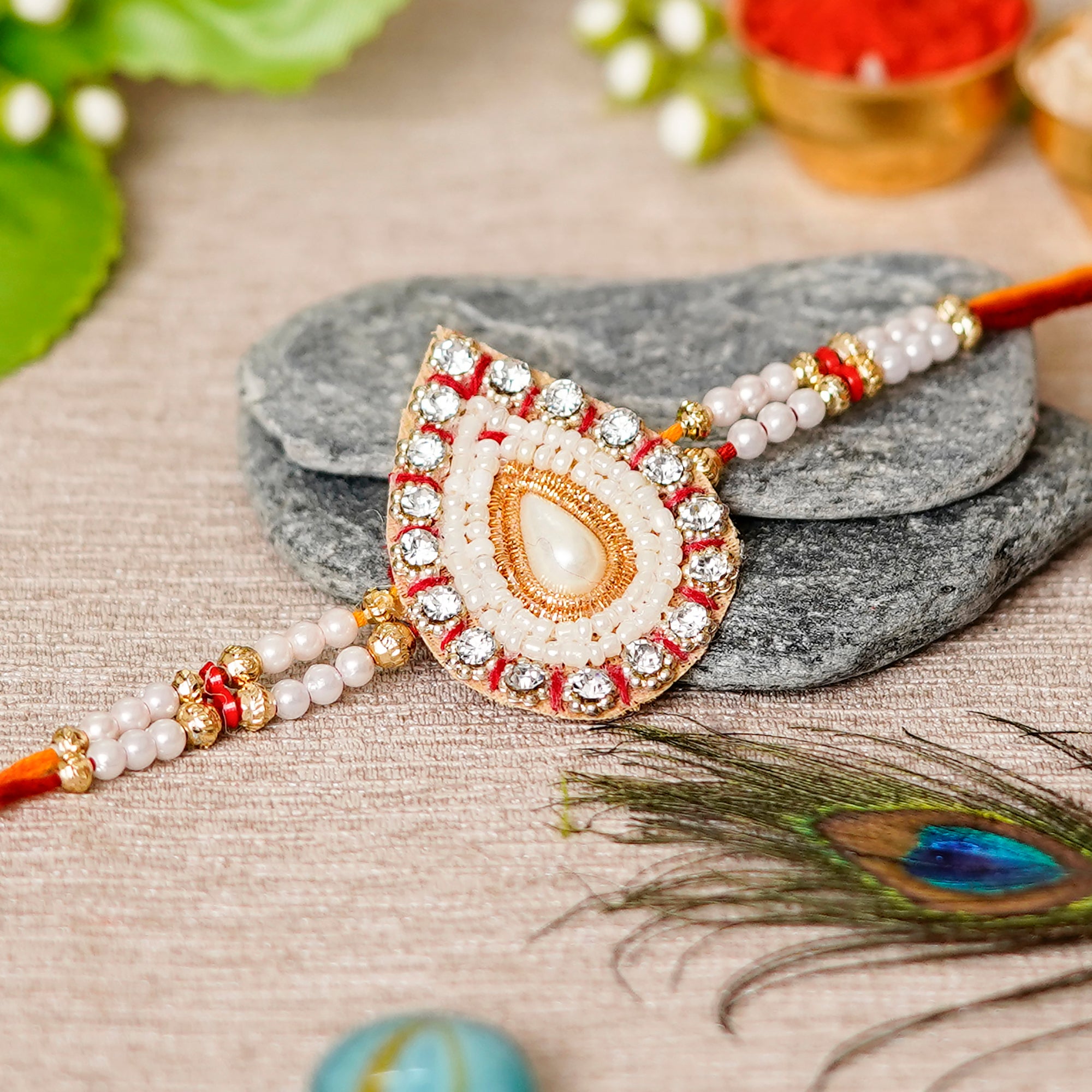 Desginer Stone and Pearl Rakhi with Lord Ganesha Idol on Decorative Handcrafted Green Floral Plate for Home and Car and Roli Chawal Pack