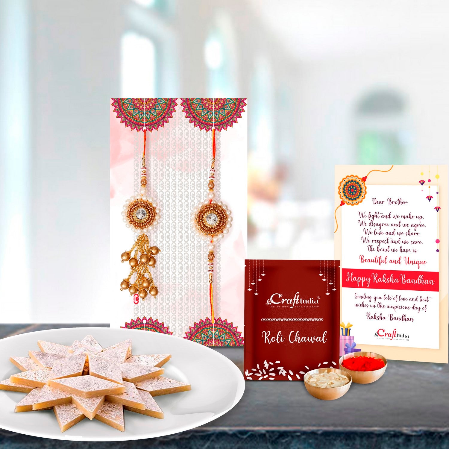 Designer Bhaiya Bhabhi Rakhi with Kaju Katli (500 Gm) and Roli Chawal Pack, Best Wishes Greeting Card - eCraftIndia Online