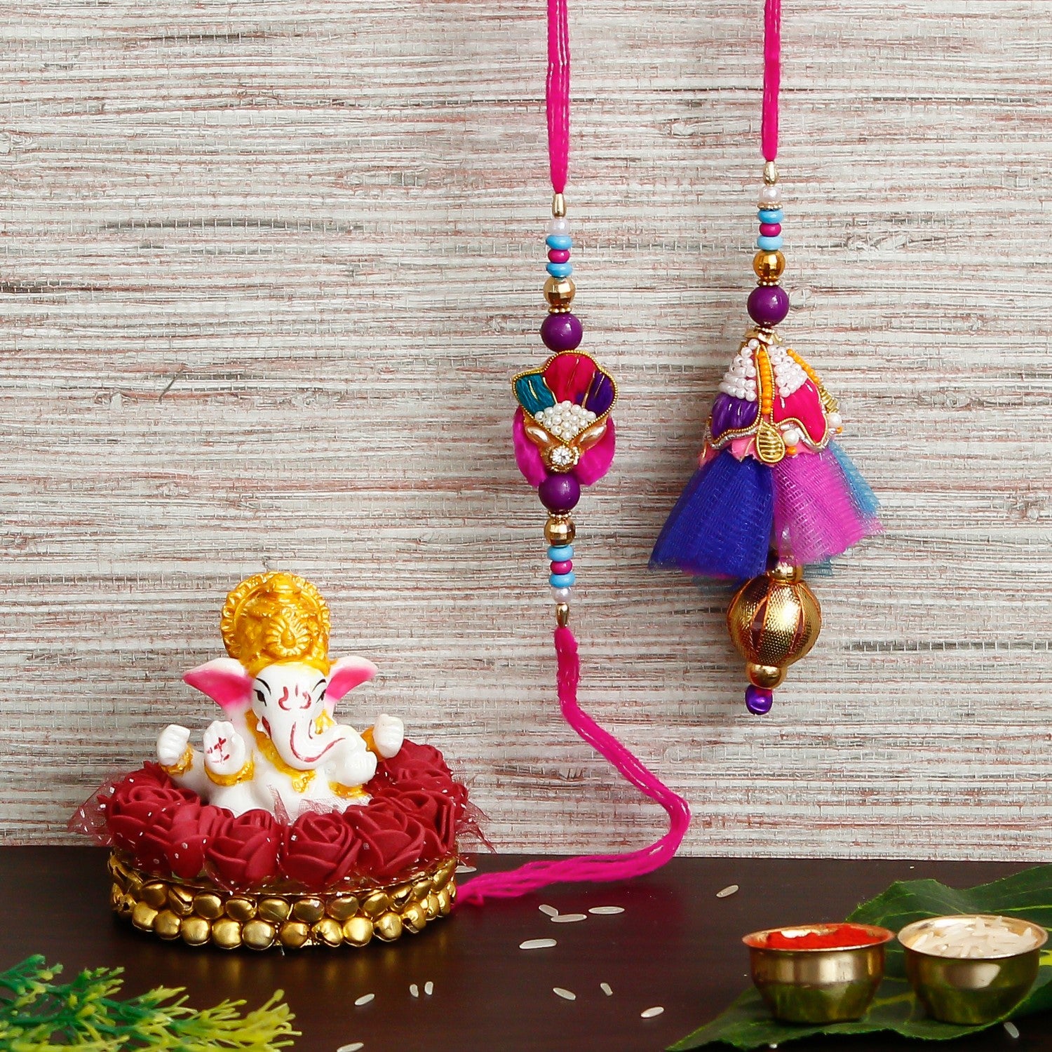 Designer Bhaiya Bhabhi Rakhi with Lord Ganesha Idol on Decorative Plate for Car & Home and Roli Chawal Pack - eCraftIndia Online