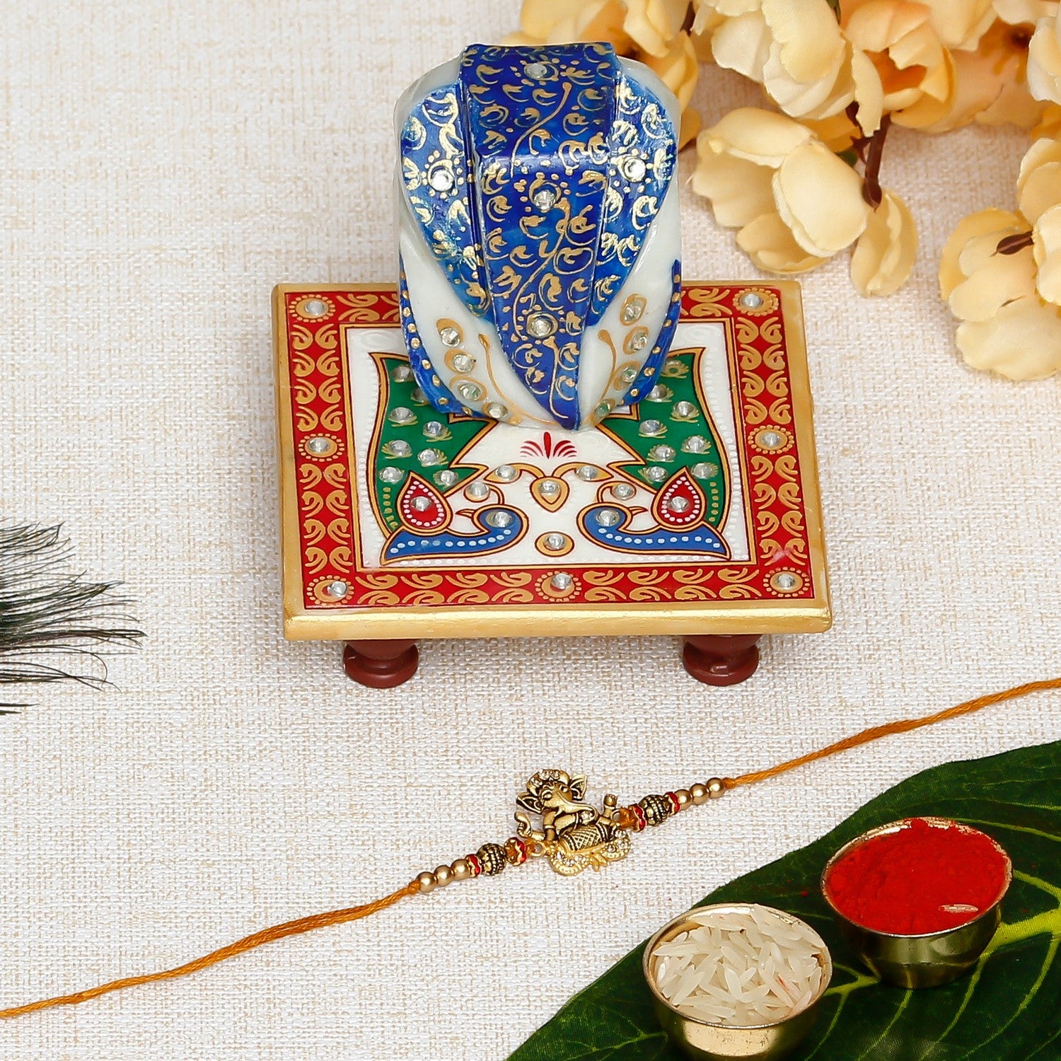 Designer Ganesha Playing Dholak Rakhi with Lord Ganesha on Marble Chowki and Roli Chawal Pack - eCraftIndia Online