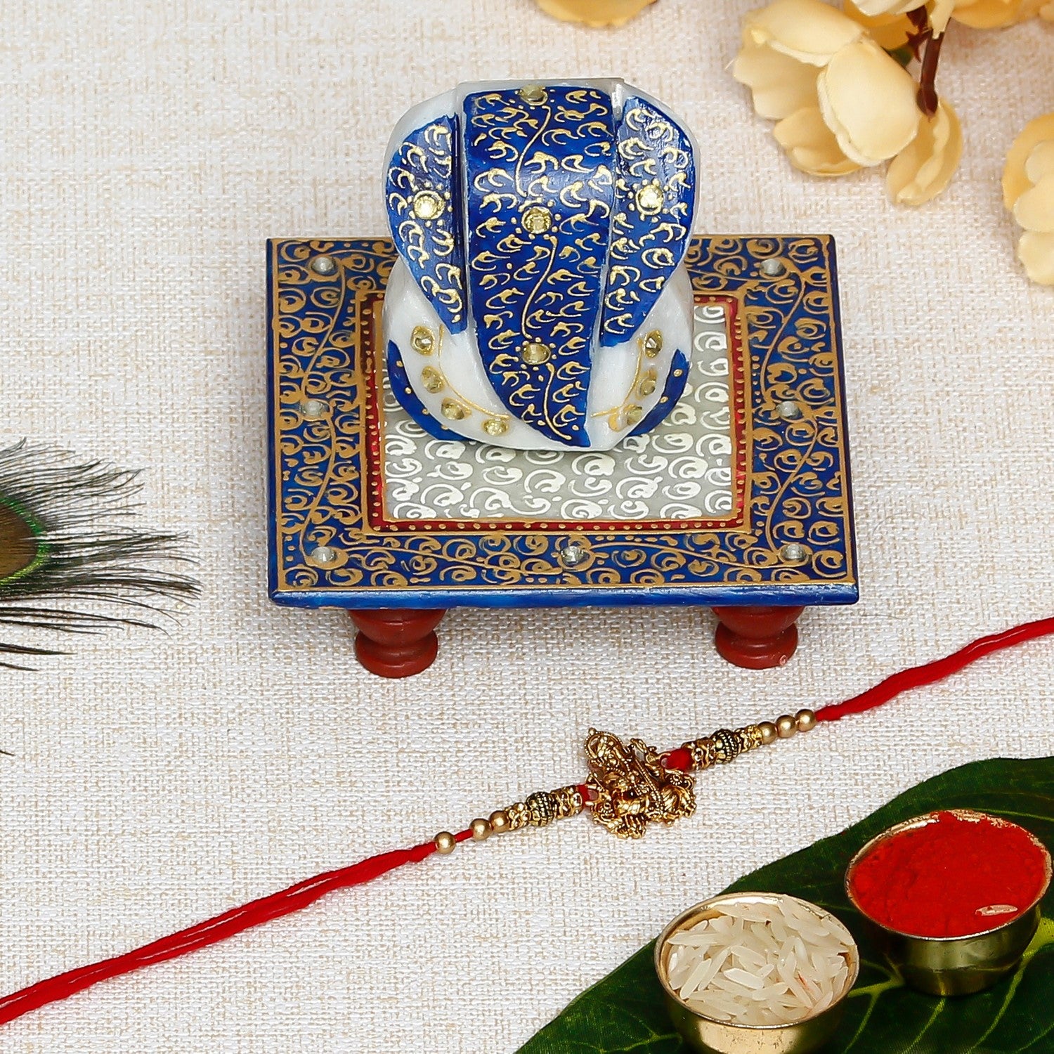 Designer Ganesha Rakhi with Lord Ganesha Marble Chowki and Roli Chawal Pack - eCraftIndia Online