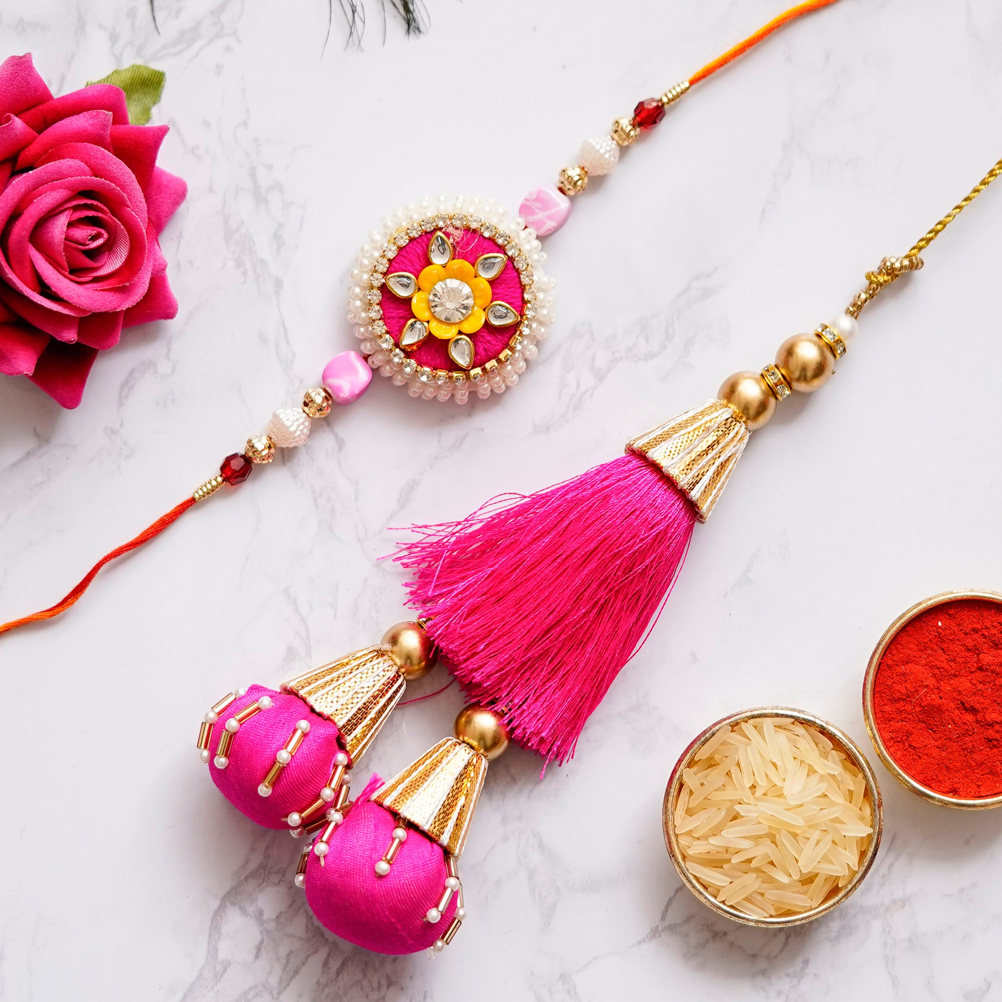 Designer Handcrafted Premium Bhaiya Bhabhi Rakhi with Ferrero Rocher (16 pcs) and Roli Chawal Pack, Best Wishes Greeting Card - eCraftIndia Online