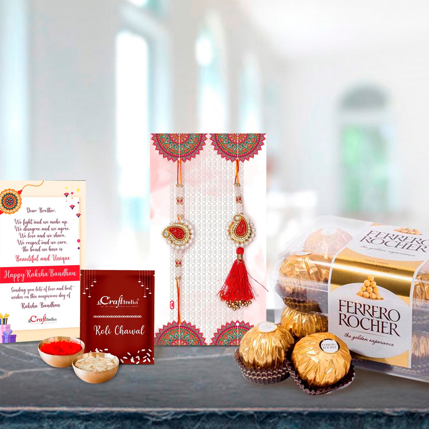 Designer Handcrafted Premium Bhaiya Bhabhi Rakhi with Ferrero Rocher (16 pcs) and Roli Chawal Pack, Best Wishes Greeting Card - eCraftIndia Online