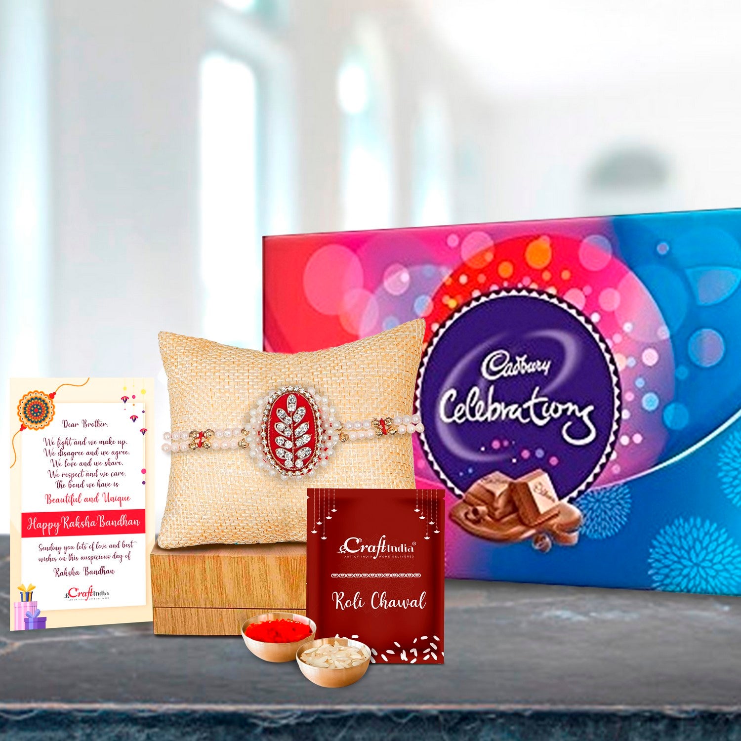 Designer Handcrafted Rakhi with Cadbury Celebrations Gift Pack of 7 Assorted Chocolates and Roli Chawal Pack, Best Wishes Greeting Card - eCraftIndia Online