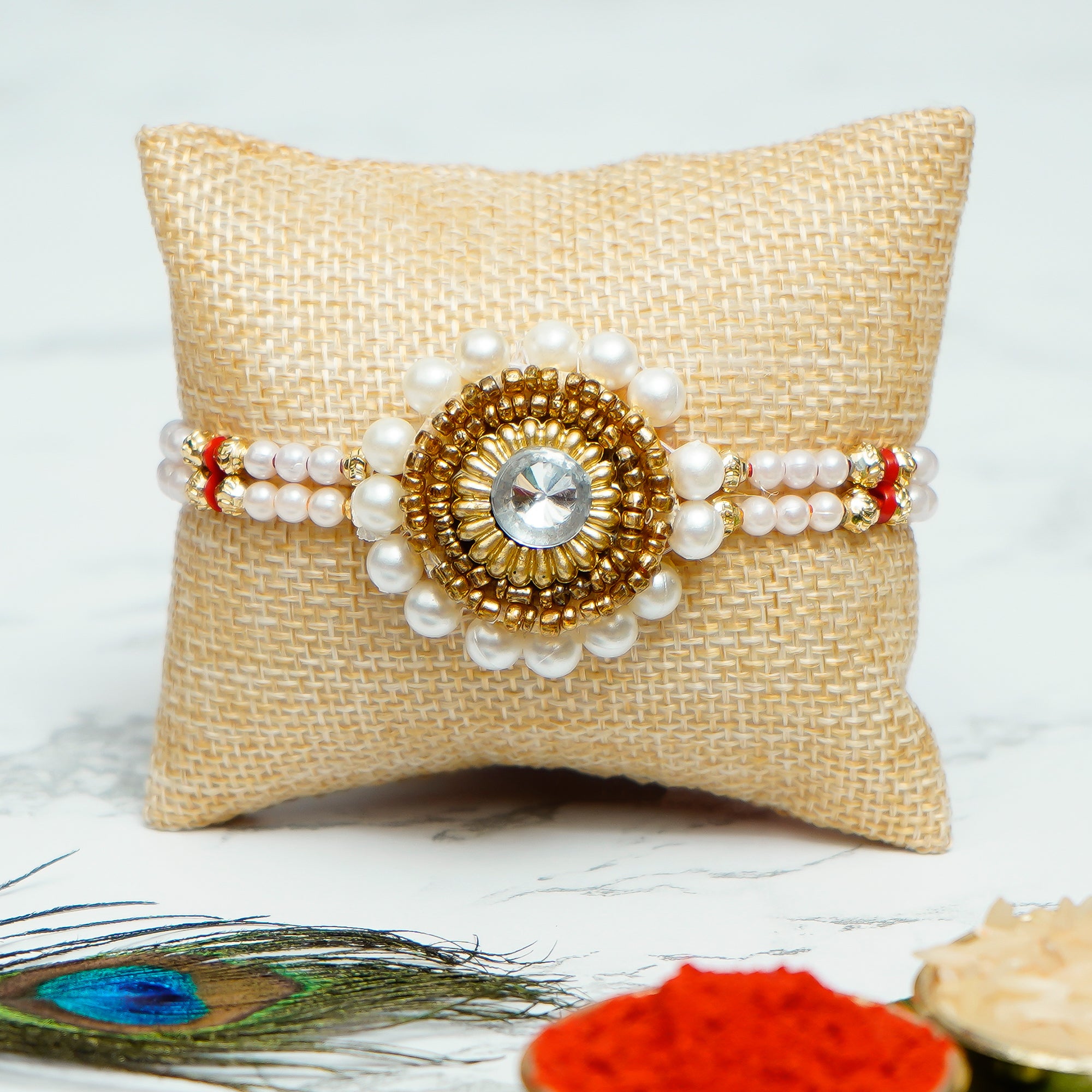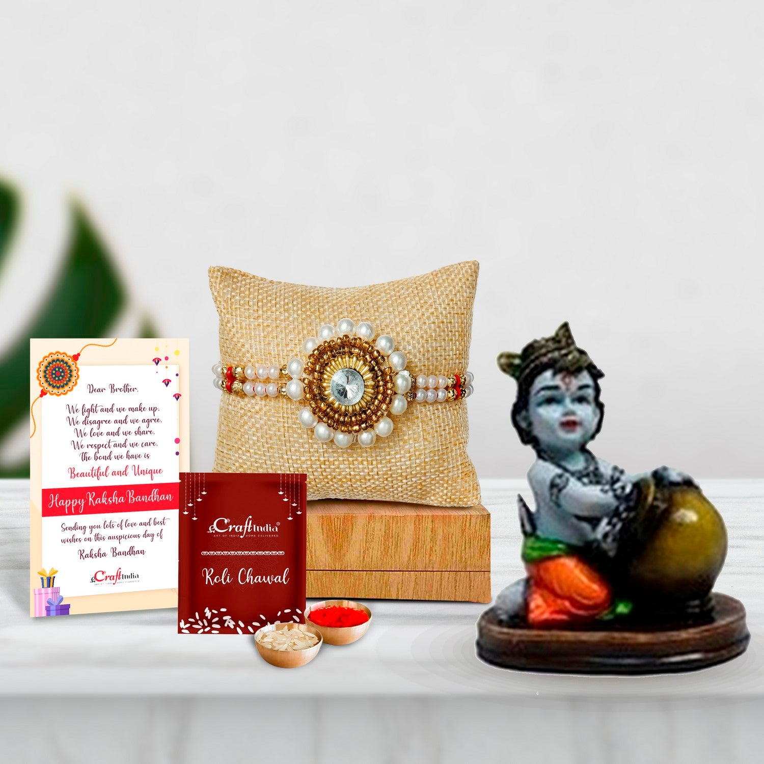 Designer Handcrafted Stone Pearl Rakhi with Decorative Showpiece of Makhan Chor and Roli Chawal Pack, Best Wishes Greeting Card - eCraftIndia Online