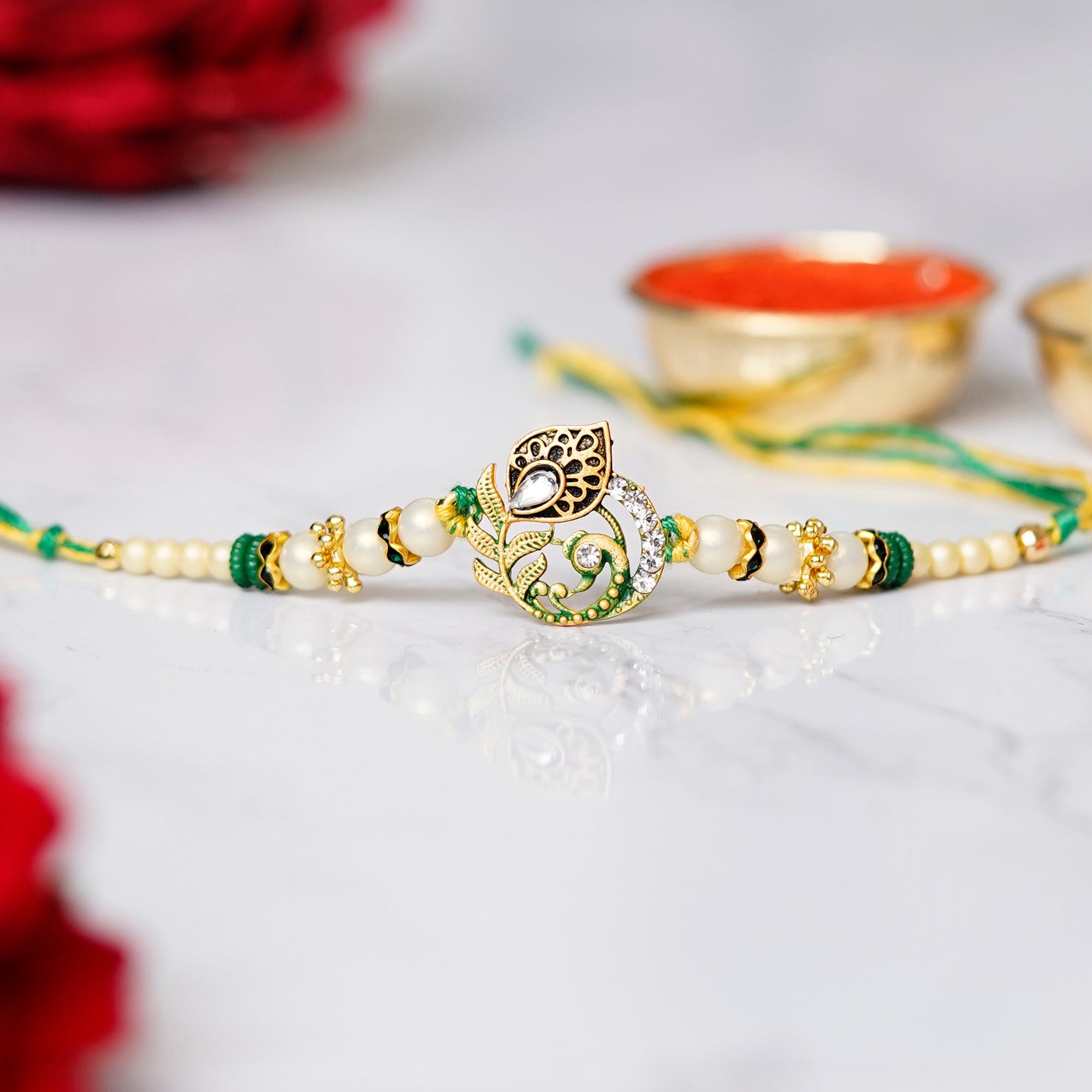 Designer Mor Pankh Rakhi and Roli Chawal Pack, Best Wishes Greeting Card - eCraftIndia Online