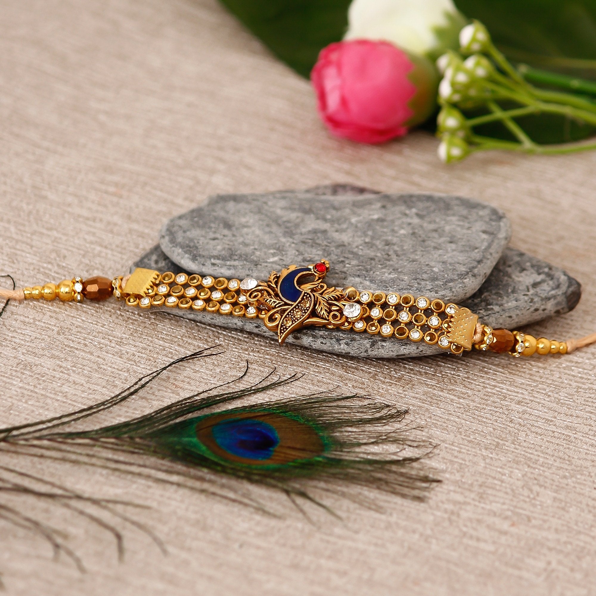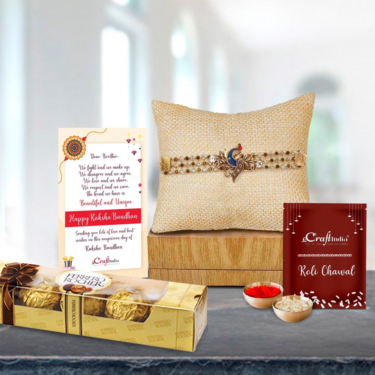 Designer Peacock Rakhi with Ferrero Rocher (4 pcs) and Roli Chawal Pack, Best Wishes Greeting Card - eCraftIndia Online