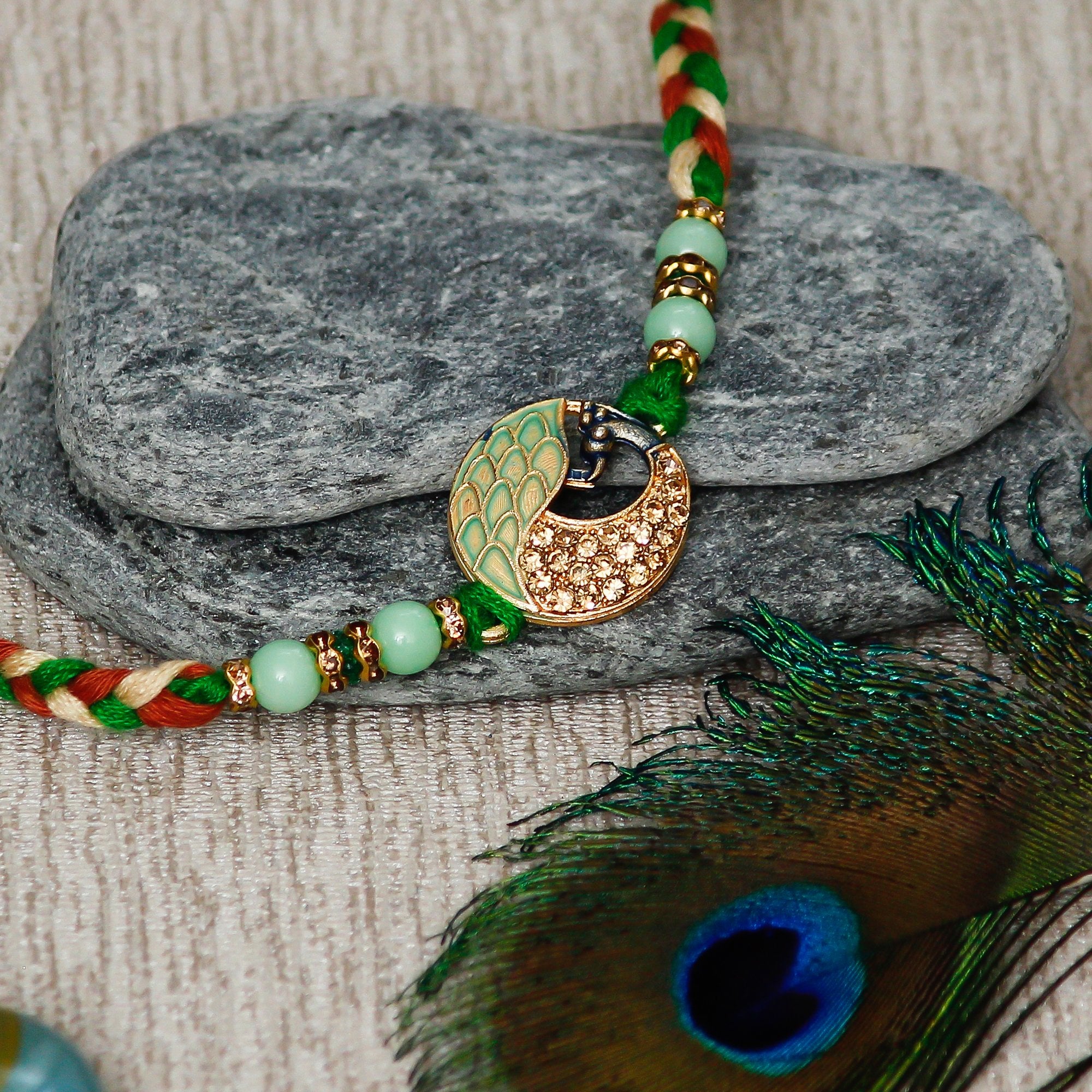 Designer Peacock Rakhi with Lord Ganesha Idol on Decorative Handcrafted Green Floral Plate for Home and Car and Roli Chawal Pack - eCraftIndia Online