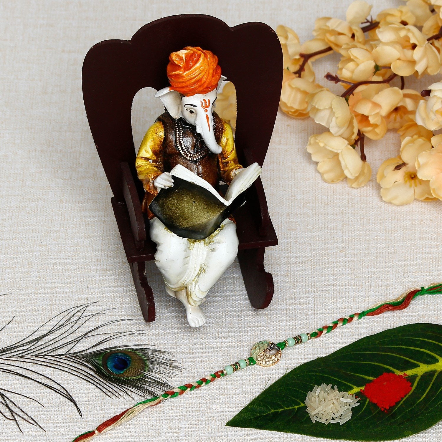 Designer Peacock Rakhi with Lord Ganesha reading Book on Wooden Chair and Roli Chawal Pack - eCraftIndia Online