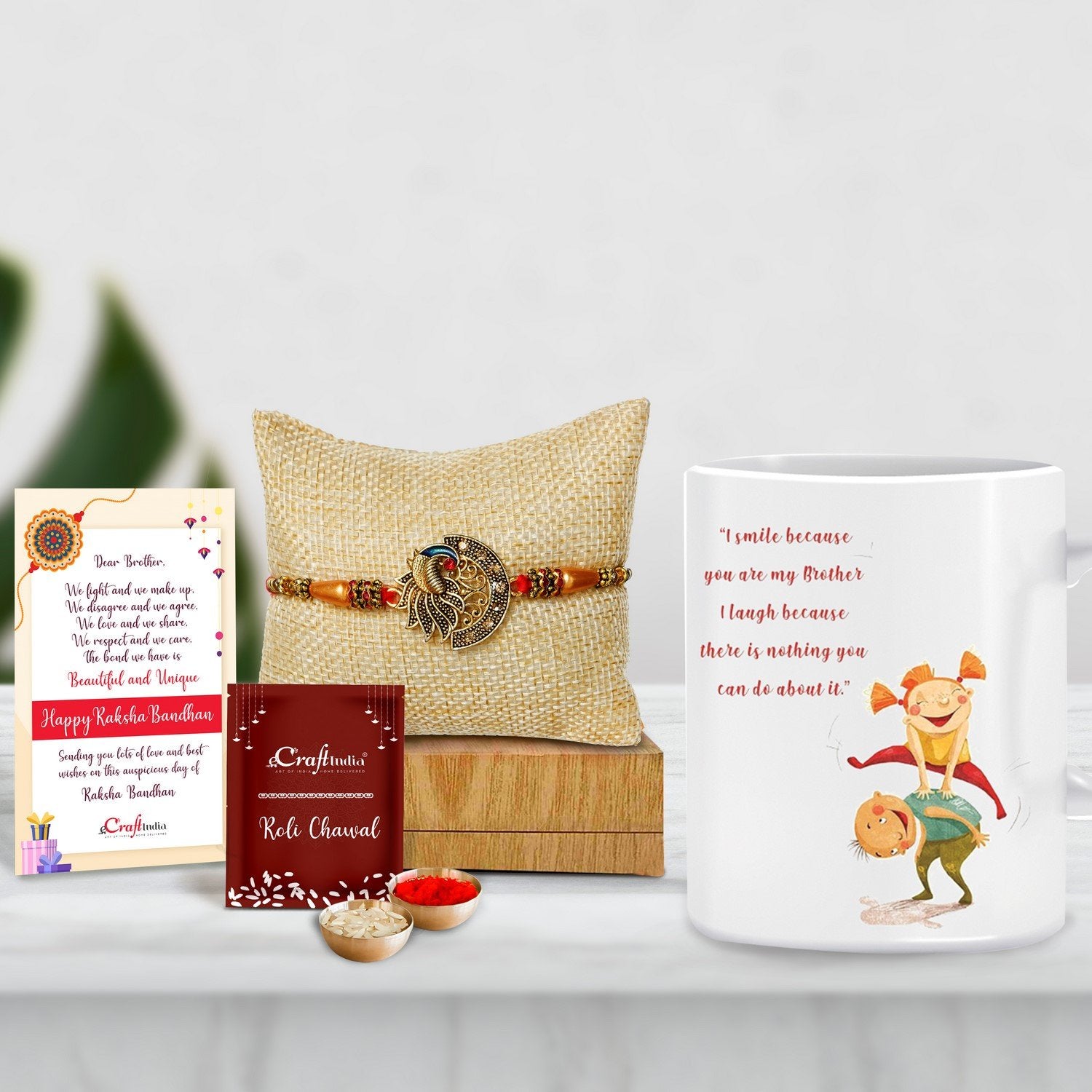 Designer Peacock Rakhi with Mug for Brother and Roli Chawal Pack, Best Wishes Greeting Card - eCraftIndia Online