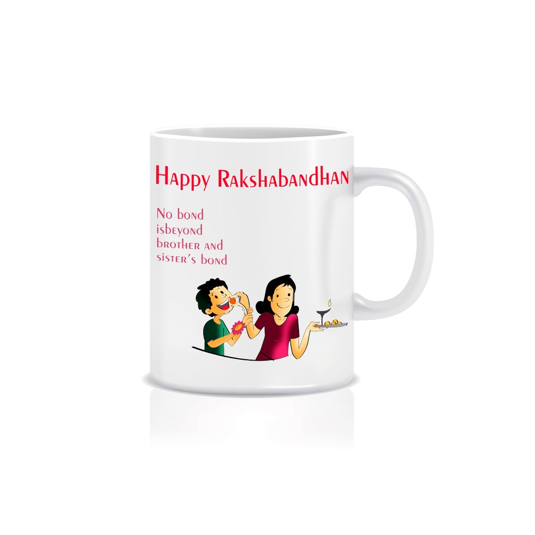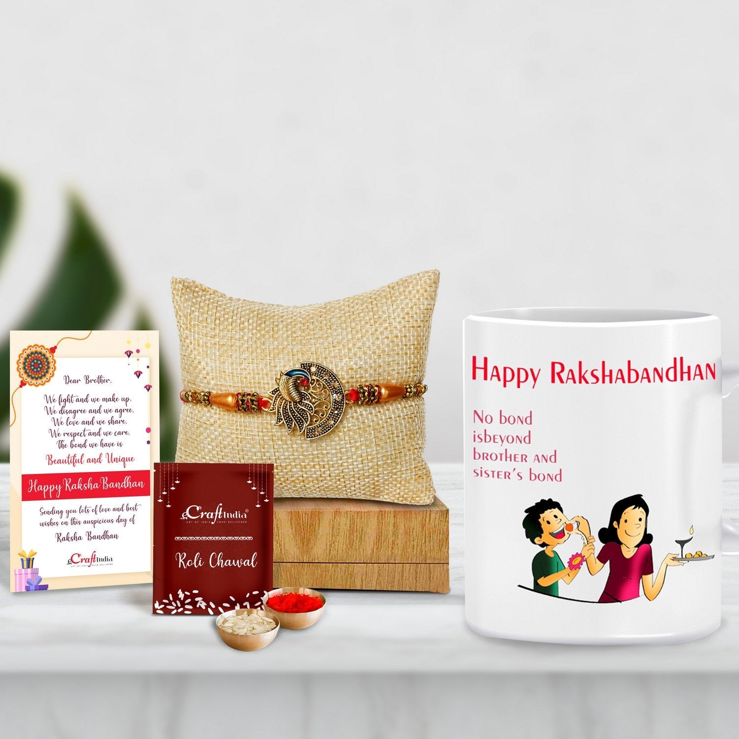 Designer Peacock Rakhi with Mug for Brother and Roli Chawal Pack, Best Wishes Greeting Card - eCraftIndia Online