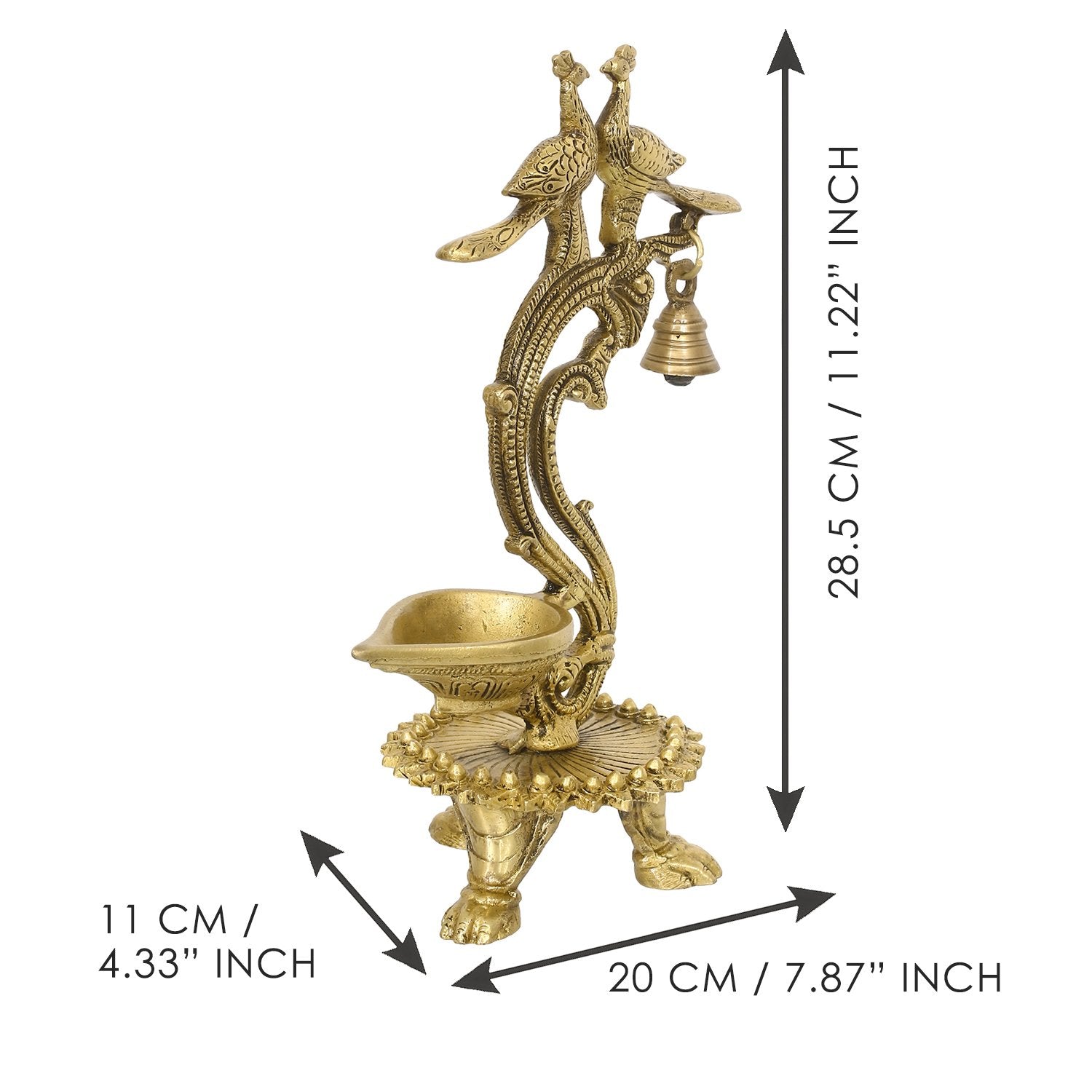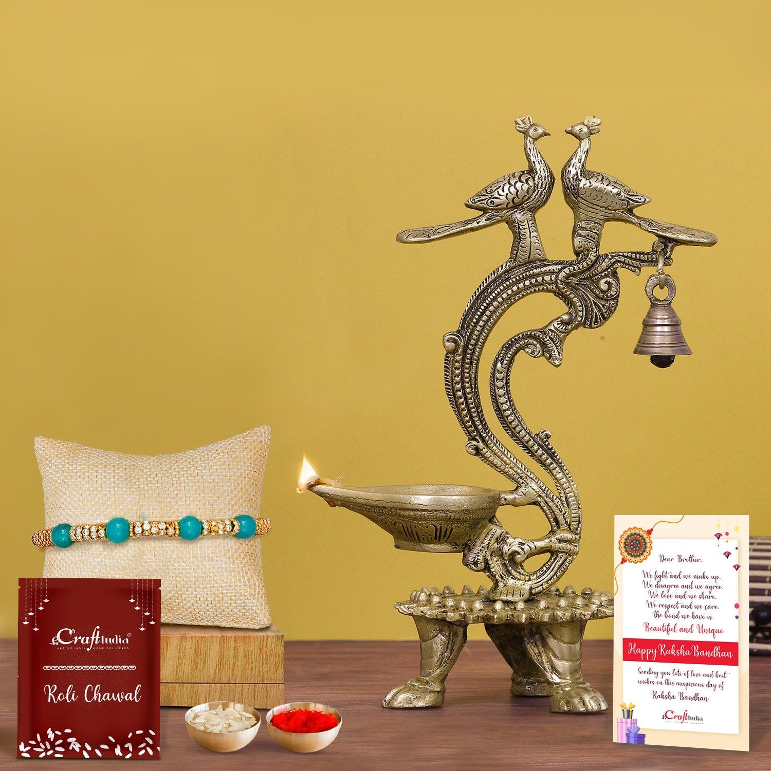 Designer Pearl Rakhi with Antique Finish Decorative Handcrafted Brass Peacock Wall Hanging Diya with Bells and Roli Chawal Pack, Best Wishes Greeting Card - eCraftIndia Online