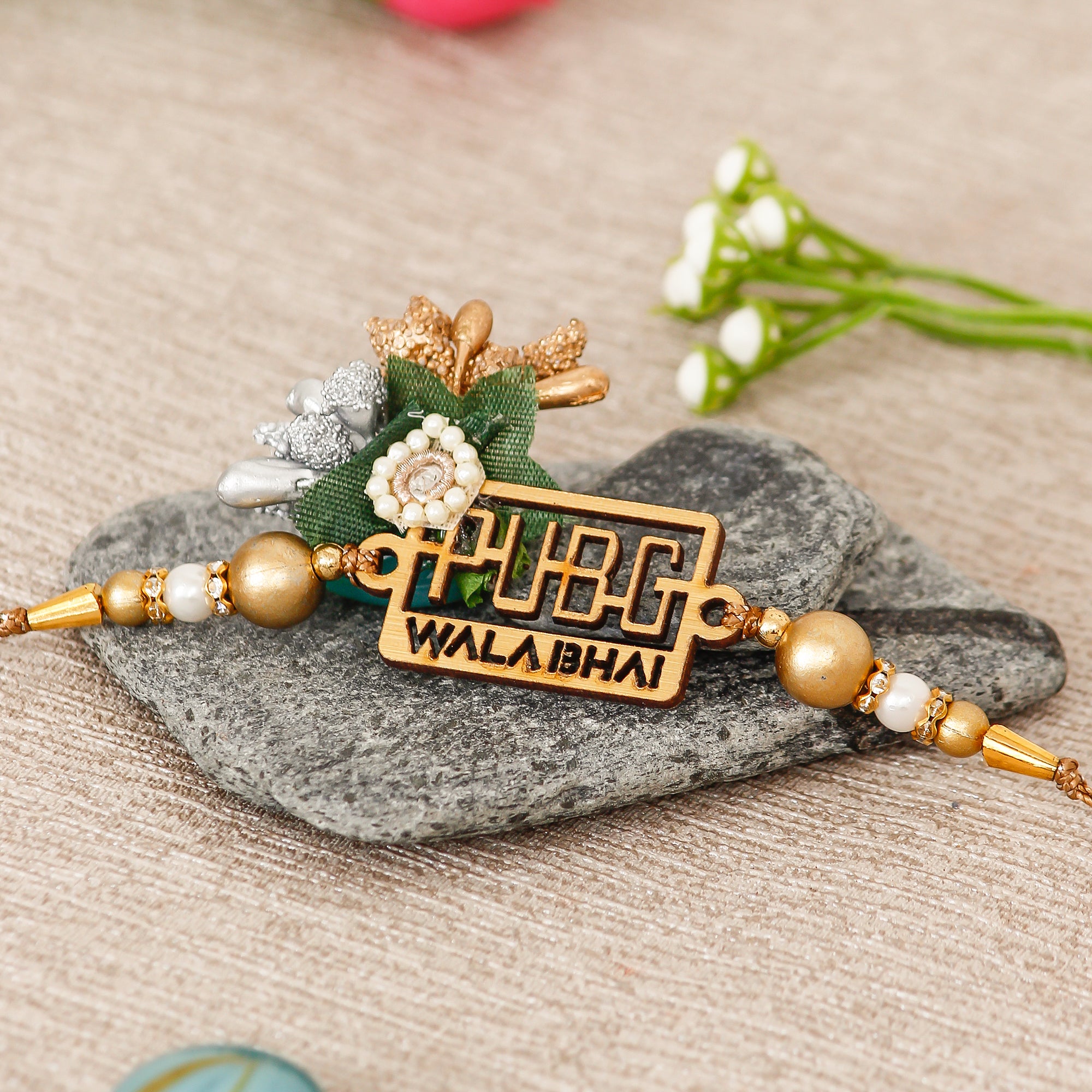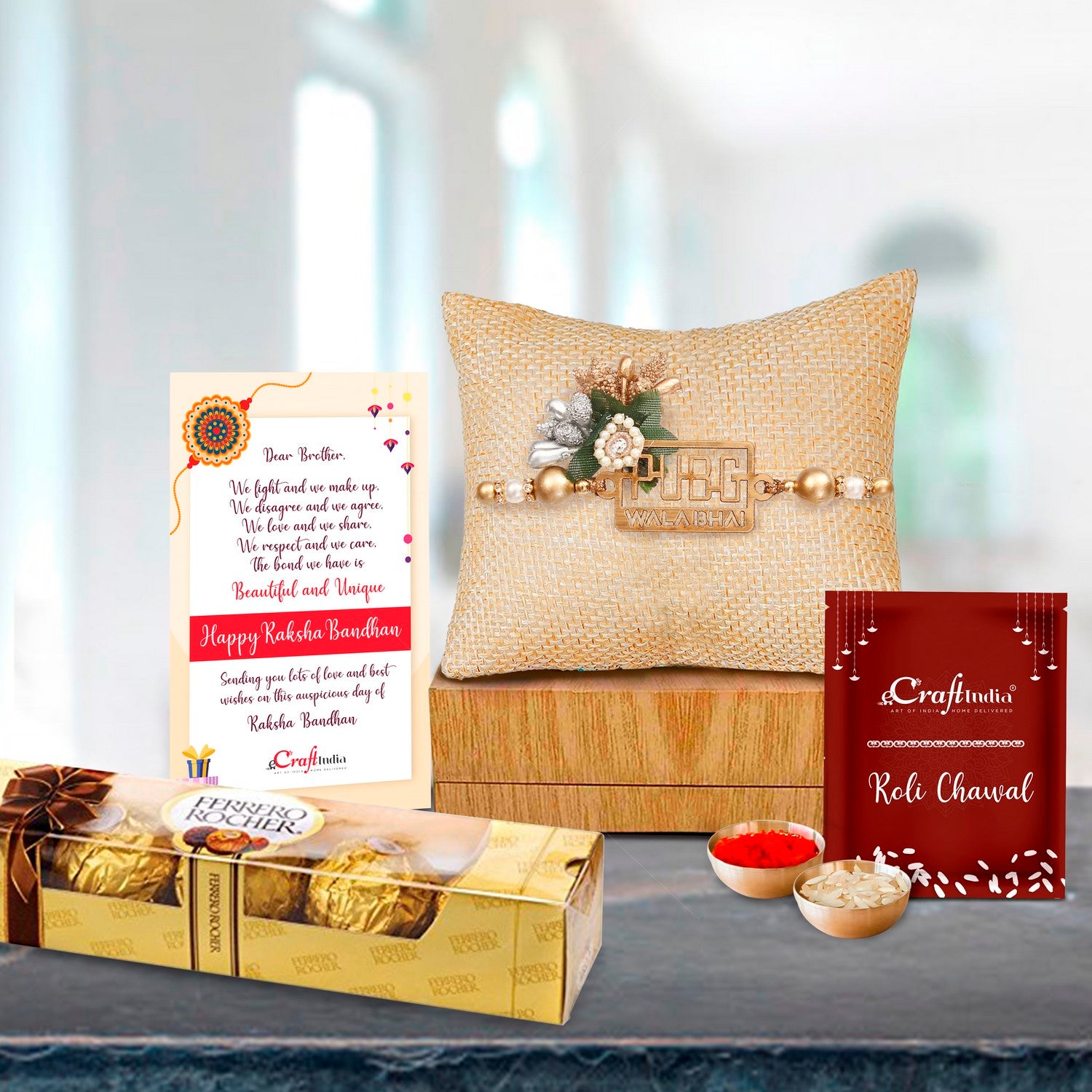 Designer Pubg Wala Bhai Rakhi with Ferrero Rocher (4 pcs) and Roli Chawal Pack, Best Wishes Greeting Card - eCraftIndia Online