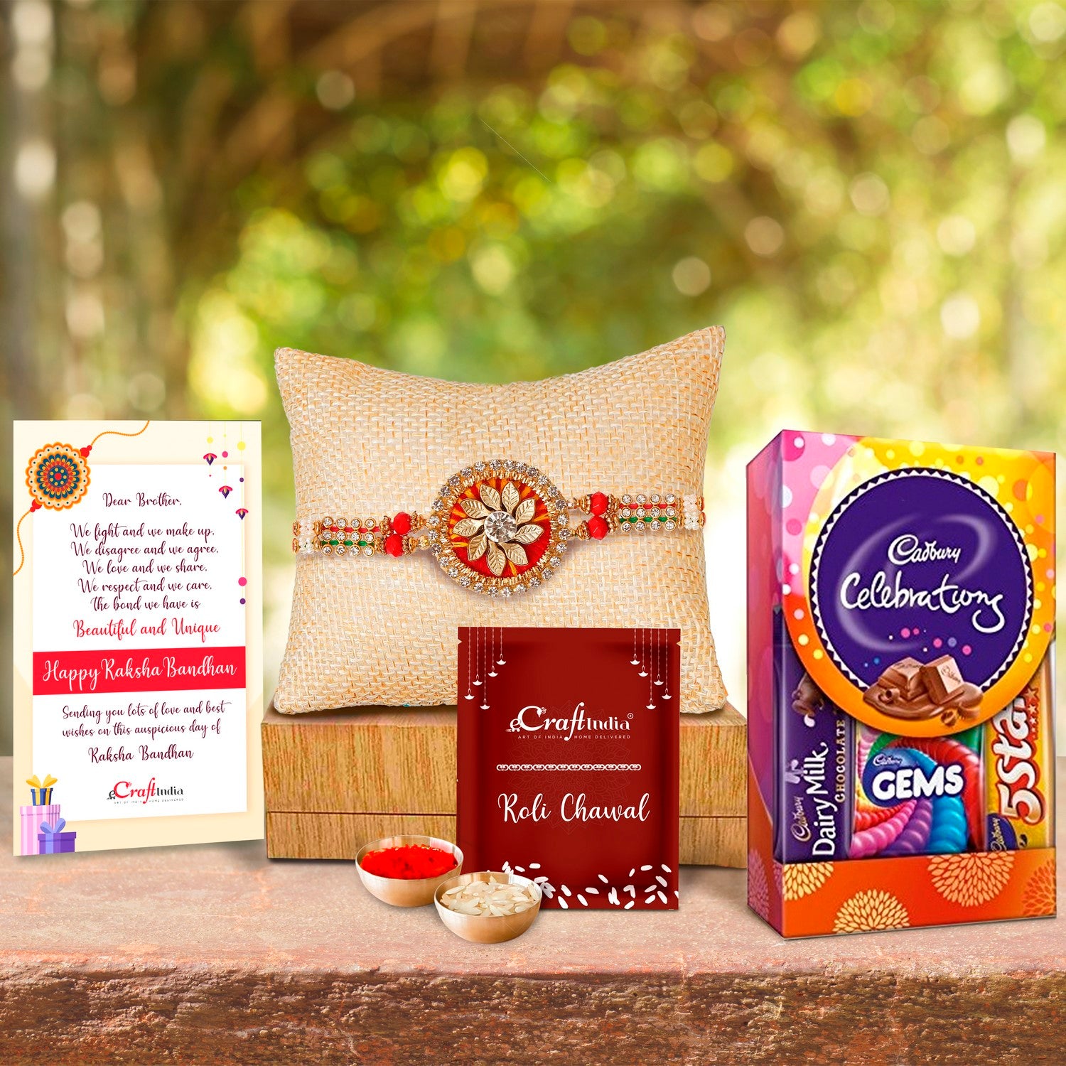 Designer Rakhi with Cadbury Celebrations Gift Pack of 5 Assorted Chocolates and Roli Chawal Pack, Best Wishes Greeting Card - eCraftIndia Online