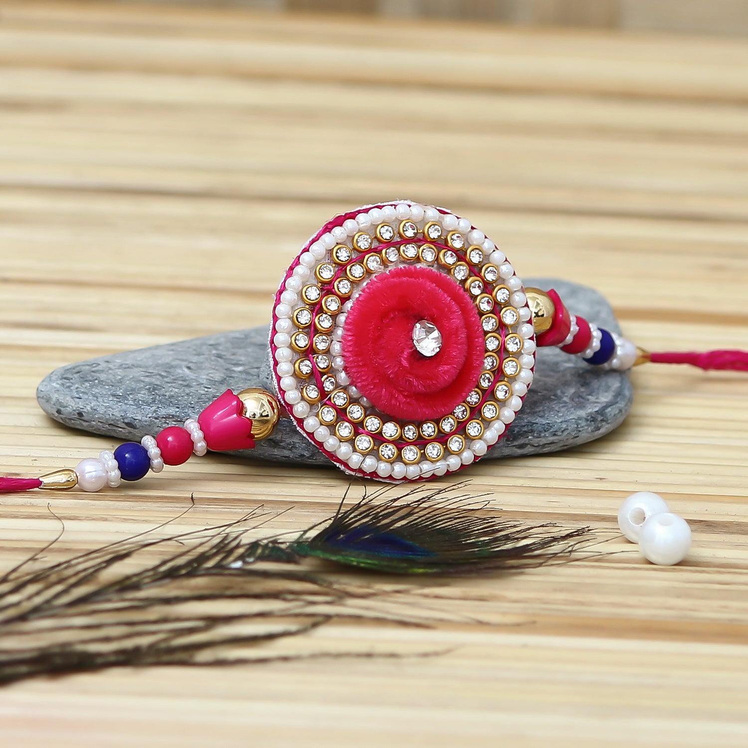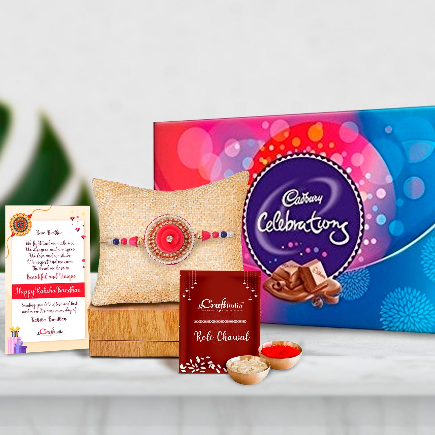 Designer Rakhi with Cadbury Celebrations Gift Pack of 7 Assorted Chocolates and Roli Chawal Pack, Best Wishes Greeting Card - eCraftIndia Online