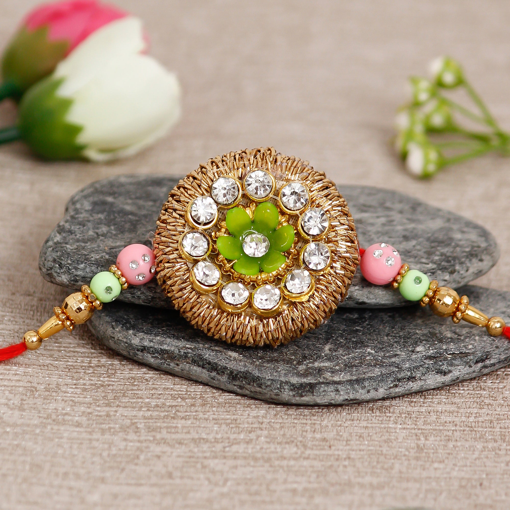 Designer Rakhi with Cadbury Celebrations Gift Pack of 7 Assorted Chocolates and Roli Chawal Pack, Best Wishes Greeting Card - eCraftIndia Online