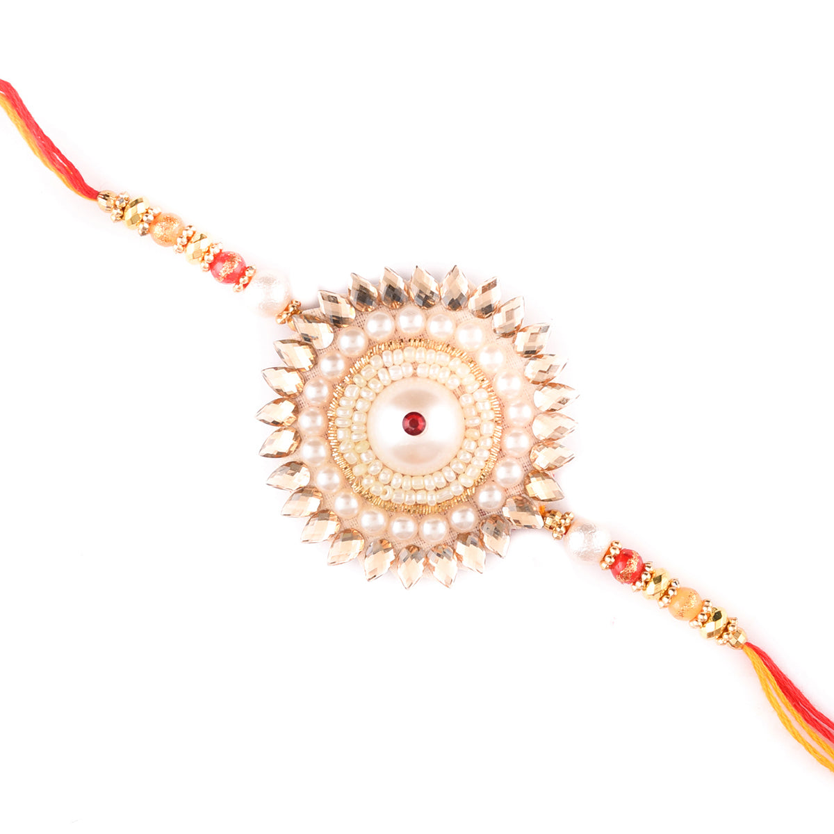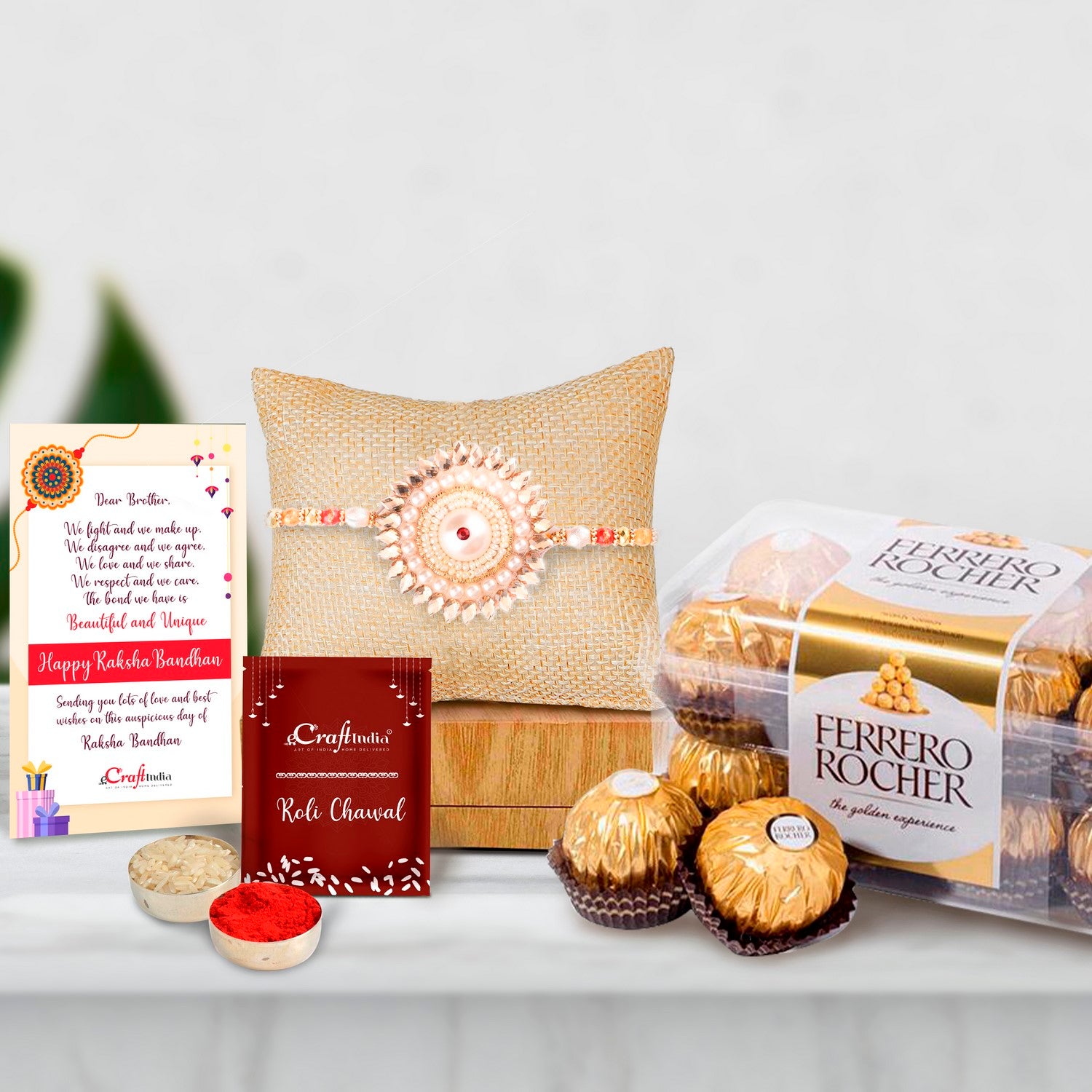 Designer Rakhi with Ferrero Rocher (16 pcs) and Roli Chawal Pack, Best Wishes Greeting Card - eCraftIndia Online