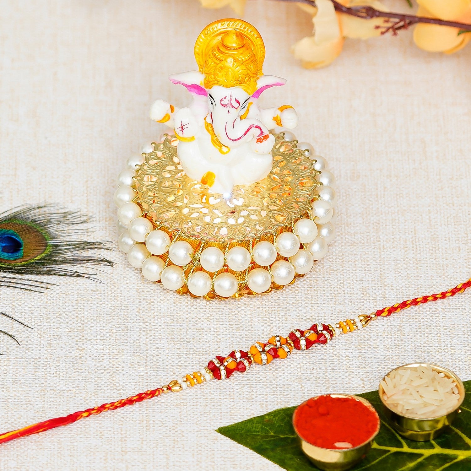 Designer Rakhi with Lord Ganesha Idol on Decorative Handcrafted Plate for Home and Car and Roli Chawal Pack - eCraftIndia Online