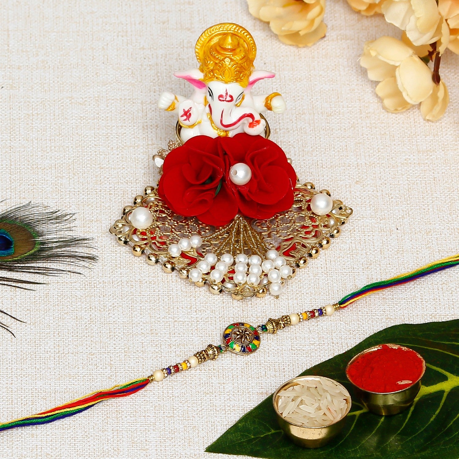 Designer Rakhi with Lord Ganesha Idol on Decorative Plate for Car & Home and Roli Chawal Pack - eCraftIndia Online