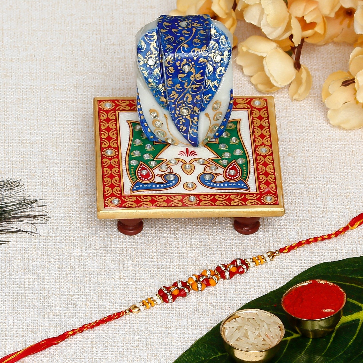 Designer Rakhi with Lord Ganesha on Marble Chowki and Roli Chawal Pack - eCraftIndia Online