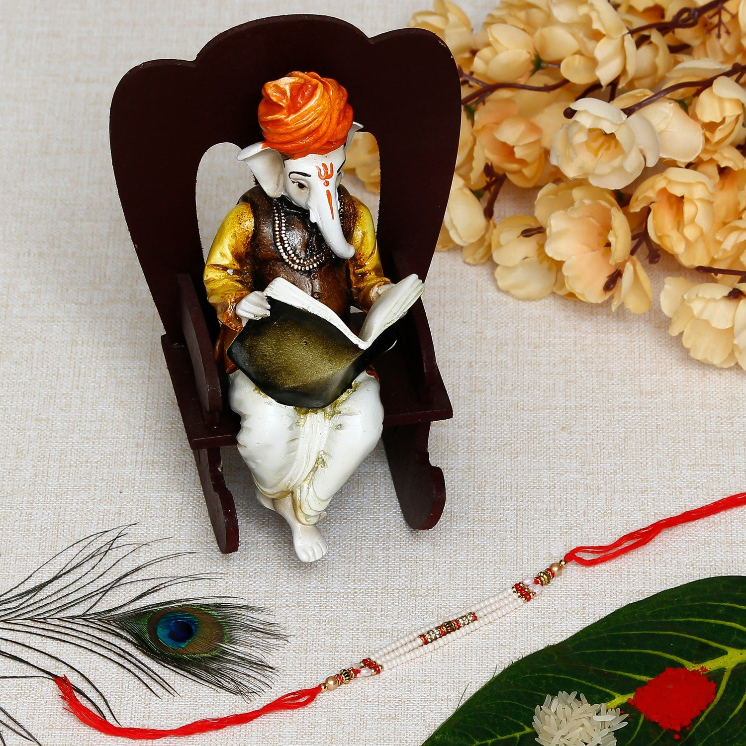 Designer Rakhi with Lord Ganesha reading Book on Wooden Chair and Roli Chawal Pack - eCraftIndia Online