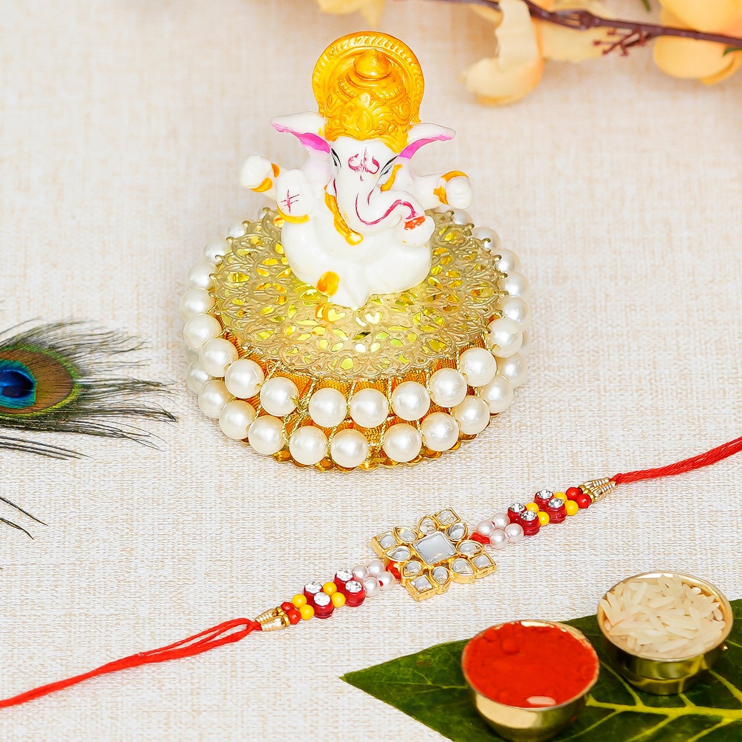 Designer Stone Work Rakhi with Lord Ganesha Idol on Decorative Handcrafted Plate for Home and Car and Roli Chawal Pack - eCraftIndia Online