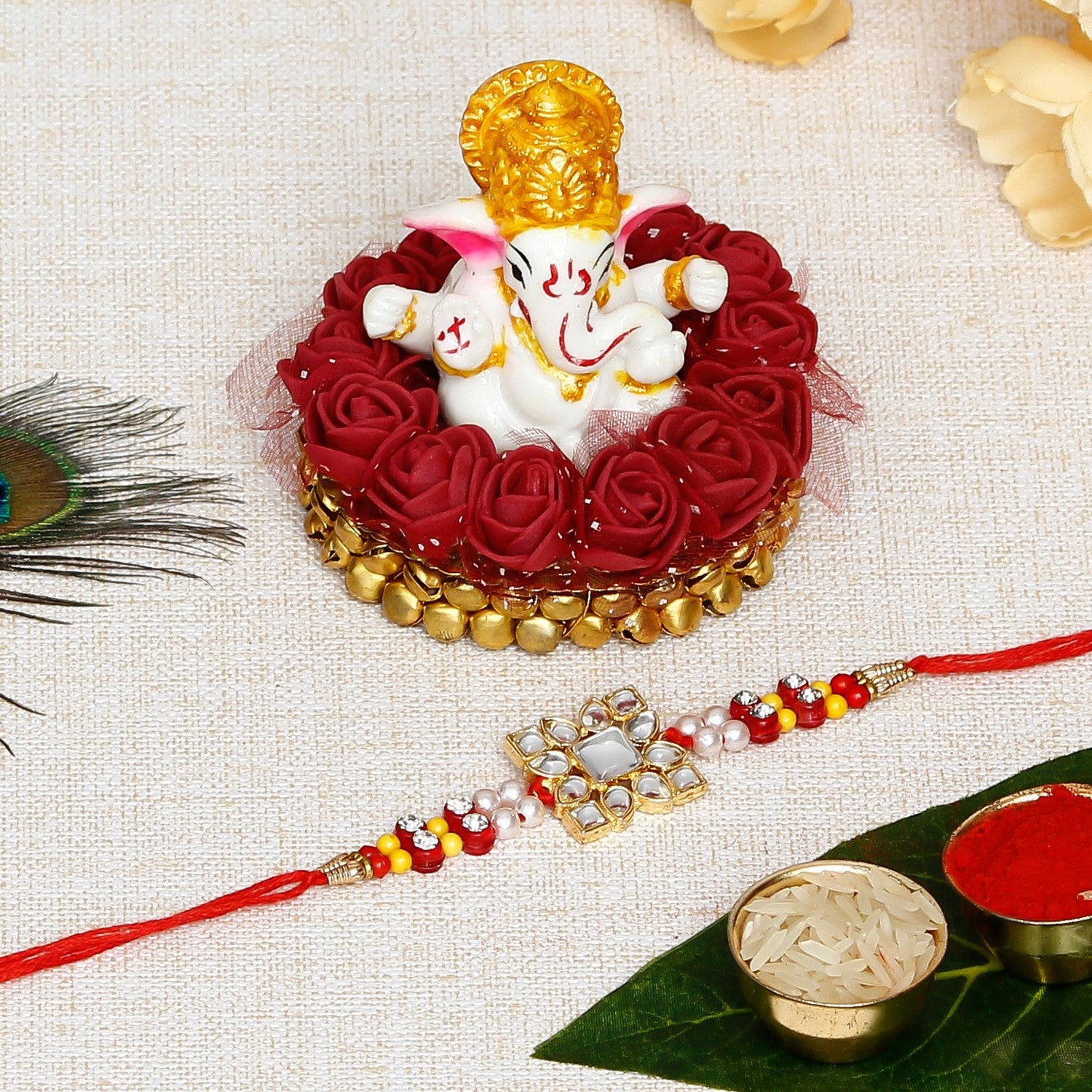 Designer Stone Work Rakhi with Lord Ganesha Idol on Decorative Plate for Car & Home and Roli Chawal Pack - eCraftIndia Online