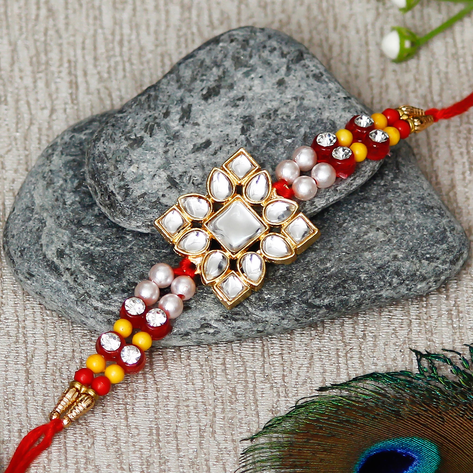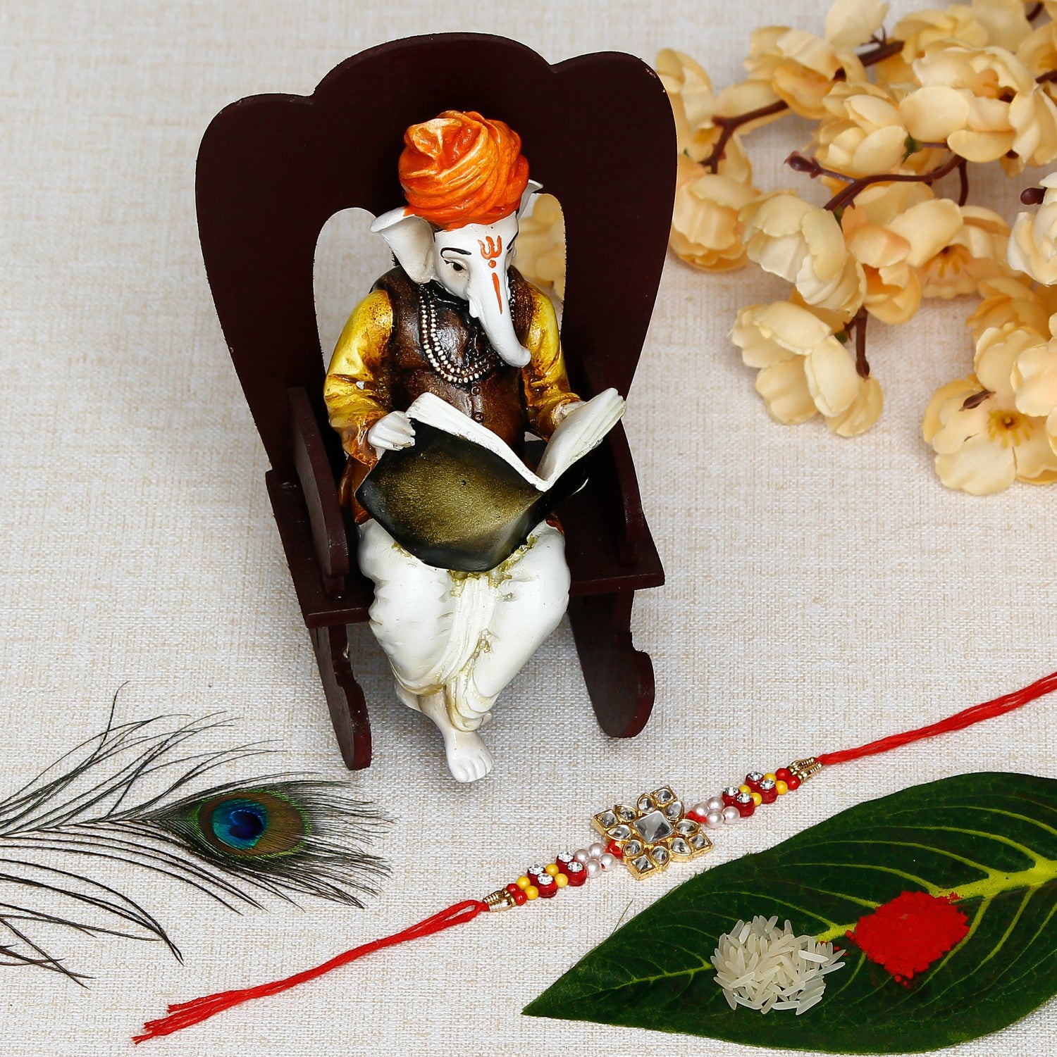 Designer Stone Work Rakhi with Lord Ganesha reading Book on Wooden Chair and Roli Chawal Pack - eCraftIndia Online