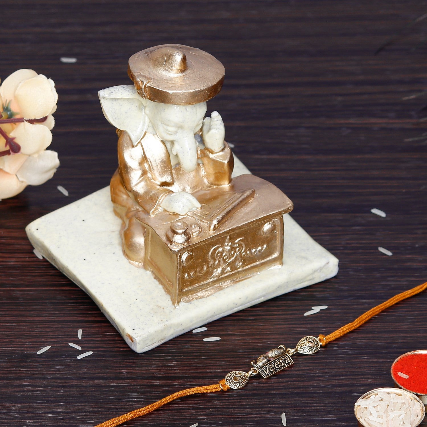 Designer Veera Rakhi with Handcrafted Ganesha Showpiece and Roli Chawal Pack - eCraftIndia Online
